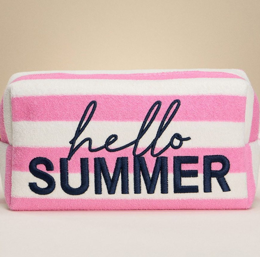 The Hello Summer Terry Zip Pouch is the perfect warm-weather accessory for beach days, poolside lounging, or tossing into your everyday tote. Designed with soft terry fabric and playful pink-and-white stripes, this pouch brings a fun pop of summer wherever you go.