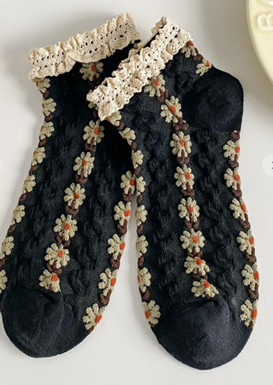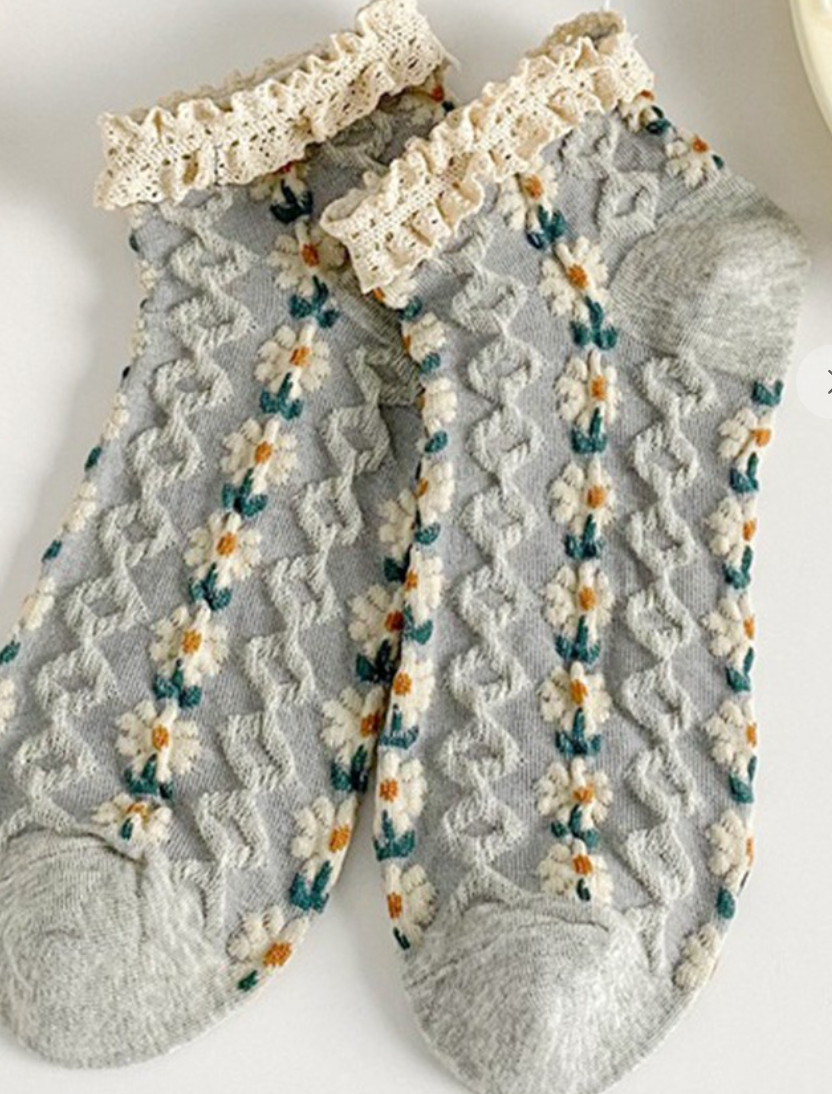 LACE TRIM FLORAL CABLE KNIT COTTON ANKLE SOCKS lace floral socks / vintage frilly socks / cottagecore lace socks / ruffle ankle socks /cute socks / romantic flower pattern socks / feminine girly style / breathable cotton socks / aesthetic daily wear / retro daisy socks Daily Outfits: Adds a cute and vintage touch to skirts, dresses, or cropped pants. Home & Lounge Wear: Soft and comfortable for cozy indoor days. Romantic Dates & Picnics: Complements girly, floral, or retro-style outfits. Photography Styling: Ideal for cottagecore or aesthetic photo themes. Gift Idea: A perfect little present for anyone who loves soft, feminine accessories.