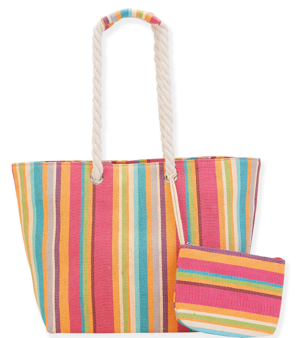 Bring the fun wherever you go with this vibrant striped tote that screams summer in the best way. Featuring cheerful multicolor stripes and sturdy rope handles, this bag is equal parts playful and practical. The roomy interior fits all your sunny-day essentials, while the included matching zip pouch keeps smaller items organized and easy to grab. Whether you’re headed to the beach, the farmers market, or a weekend getaway, this tote adds an instant pop of color to your warm-weather look—major women’s summer fashion energy.