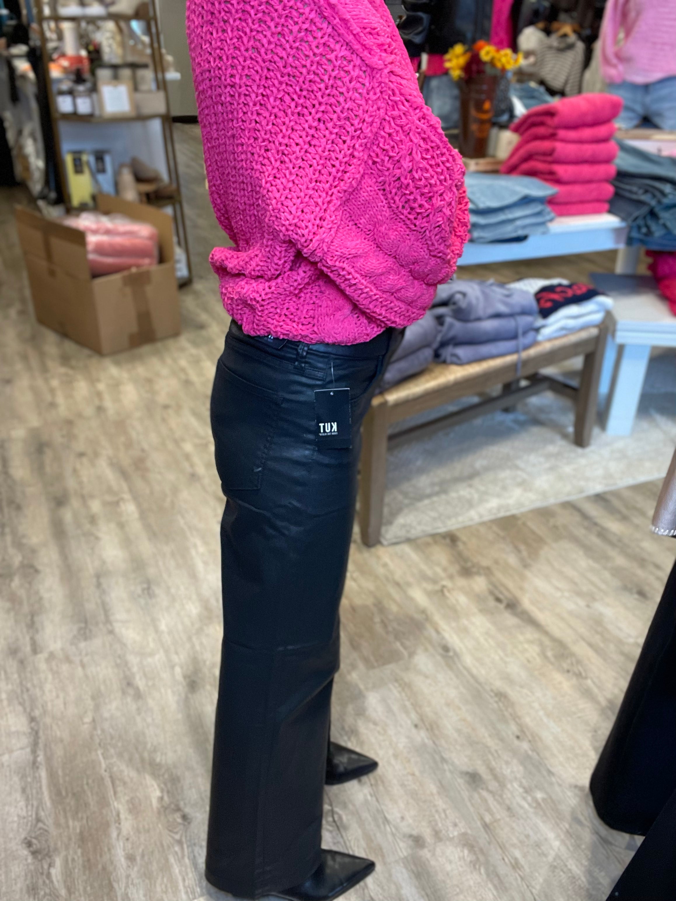 Add a touch of edge to your classic denim look with these Coated Wide Leg Jeans. Crafted with a sleek, leather-like coating, these jeans deliver a sophisticated shine while maintaining the comfort and stretch of traditional denim. Perfect for dressing up your favorite blouse or creating a modern night-out look.