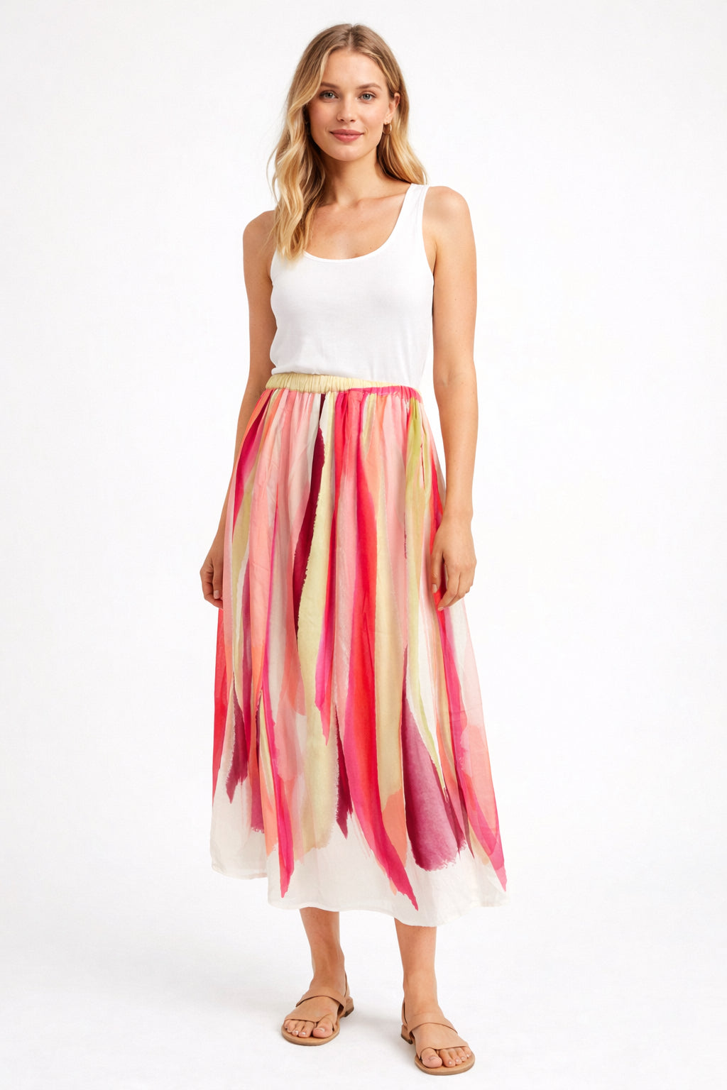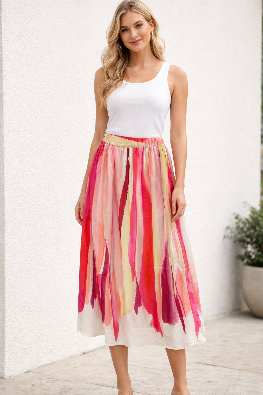 • Eye-catching watercolor stripe print in pink, coral, and soft yellow tones
