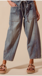 These jeans offer a roomy, wide-leg fit with a comfortable mid-rise waist. The drawstring adds flexibility, making them ideal for casual wear or dressing up with a tucked-in blouse.