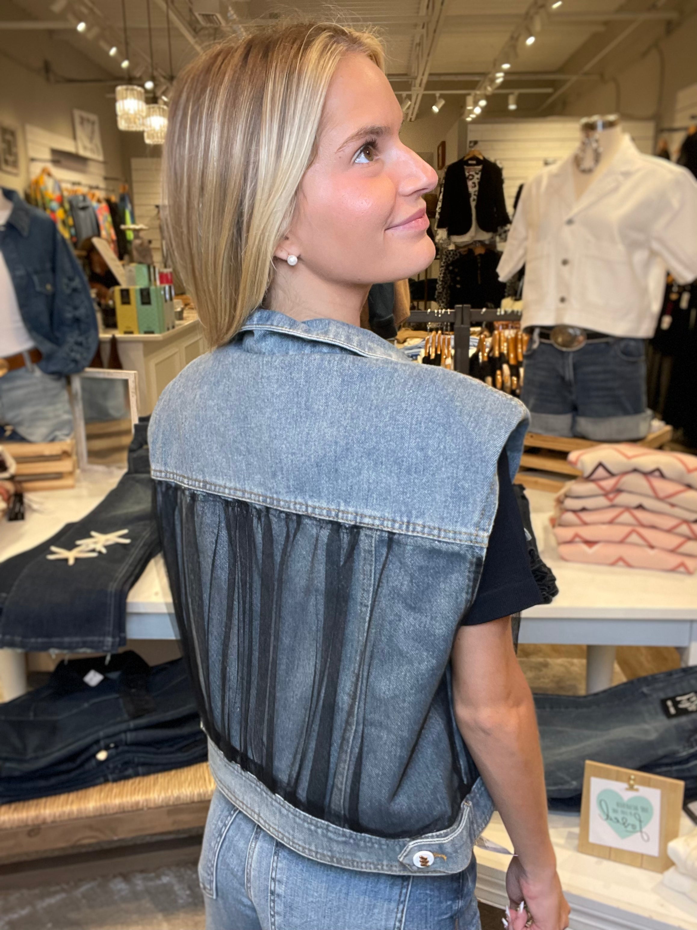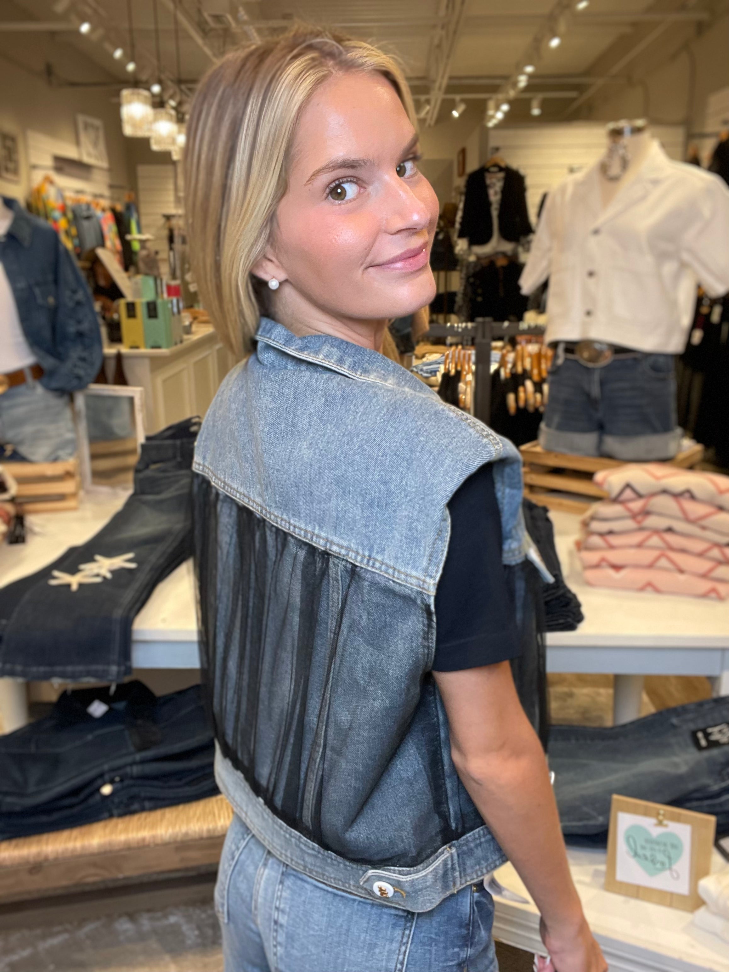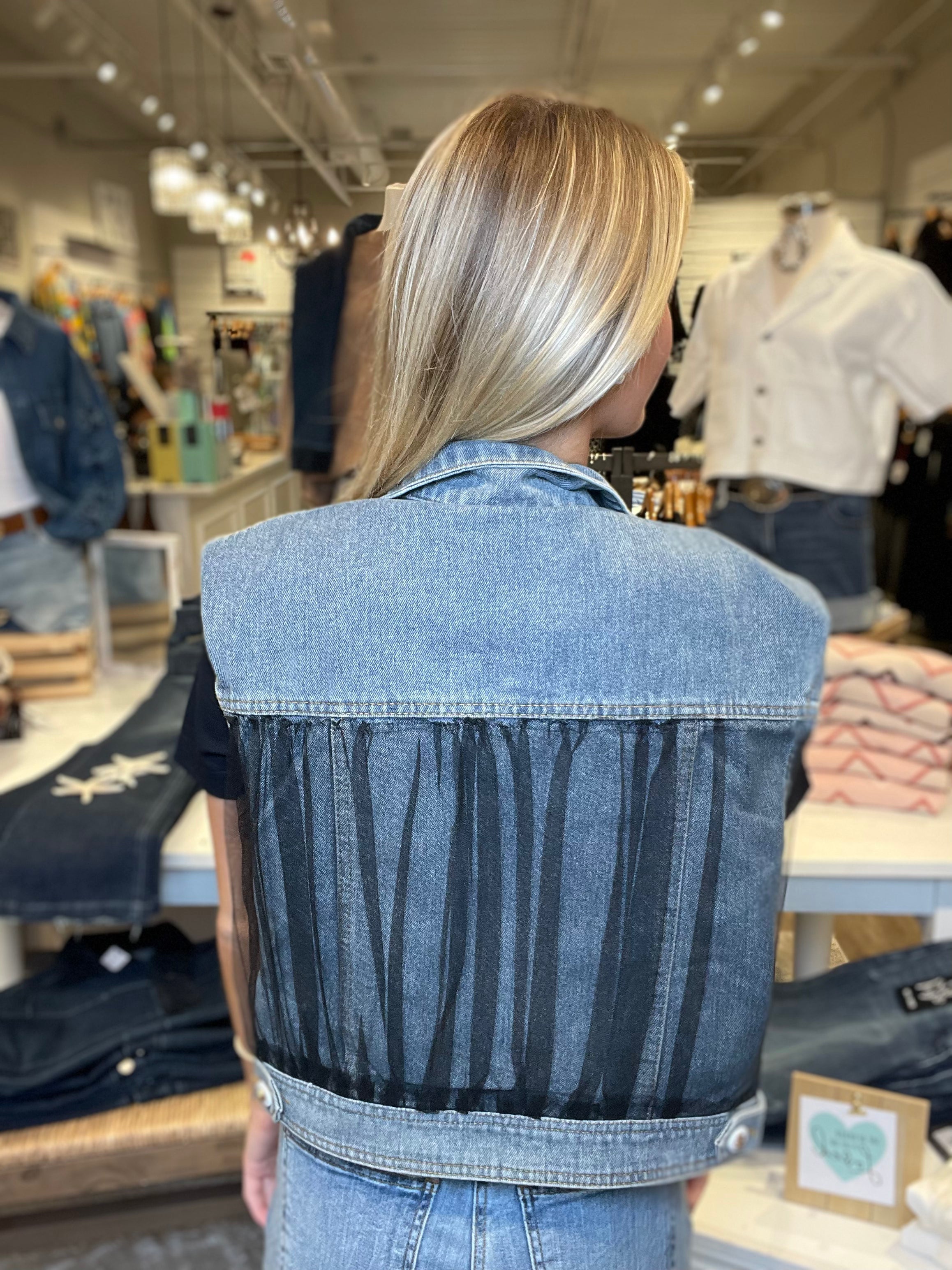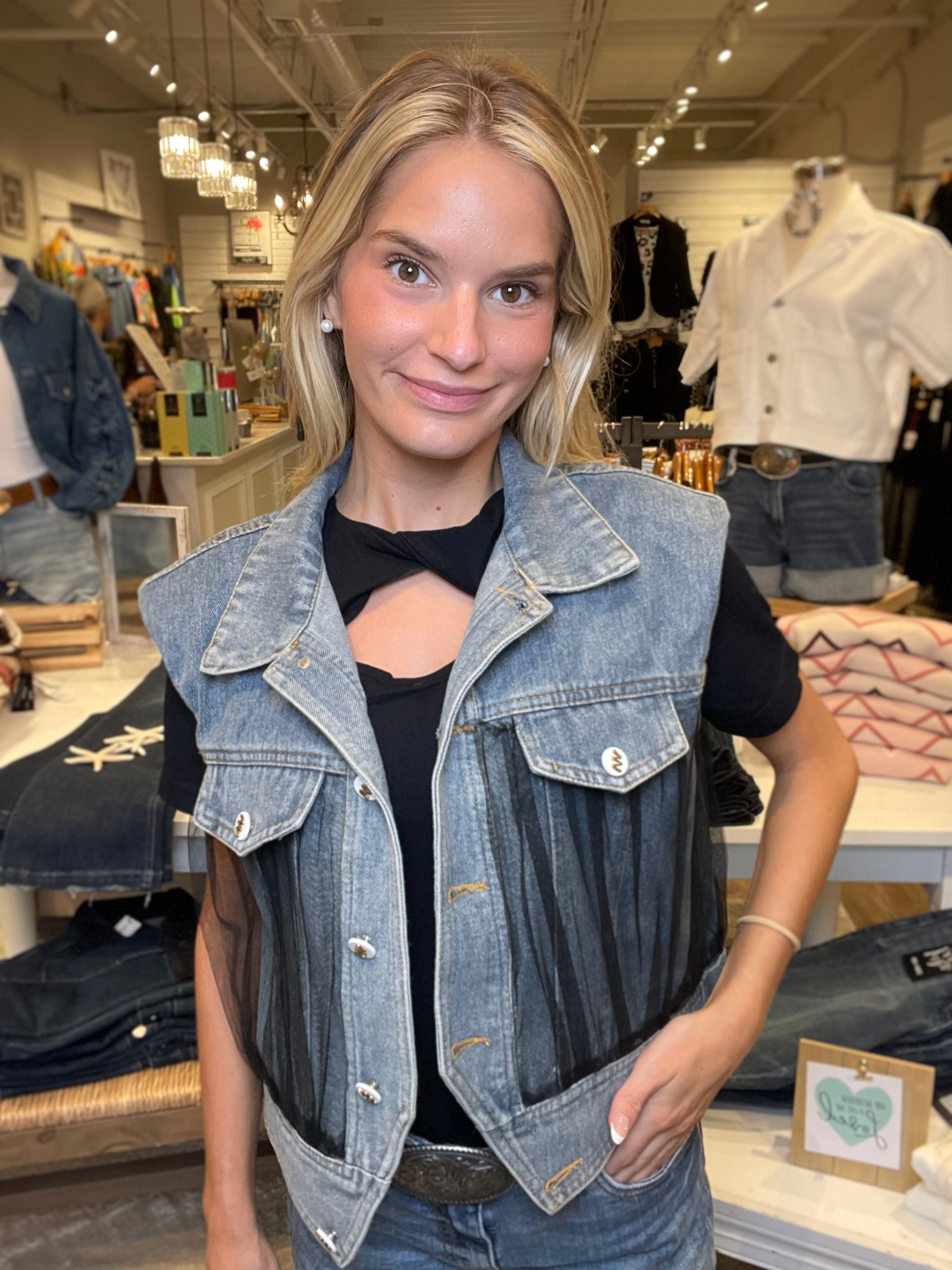 Turn up the edge on your denim collection with this sleeveless denim vest featuring a subtle yet striking black overlay. Designed with a button-front closure, flap chest pockets, and a modern cropped fit, this vest blends classic denim structure with a bold twist. Perfect for layering year-round, it’s the piece that takes any outfit from simple to standout.
