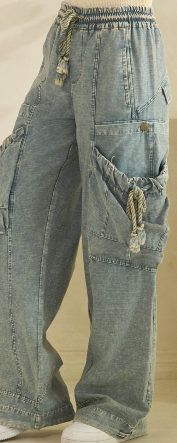 Washed Elastic Waist String Big Pocket Trousers