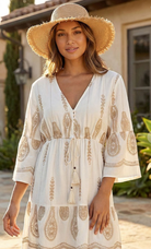This effortlessly elegant dress blends relaxed bohemian charm with elevated detailing. Featuring soft embroidery and a flattering cinched waist, it’s the perfect piece for sunny days, vacations, and special casual moments.