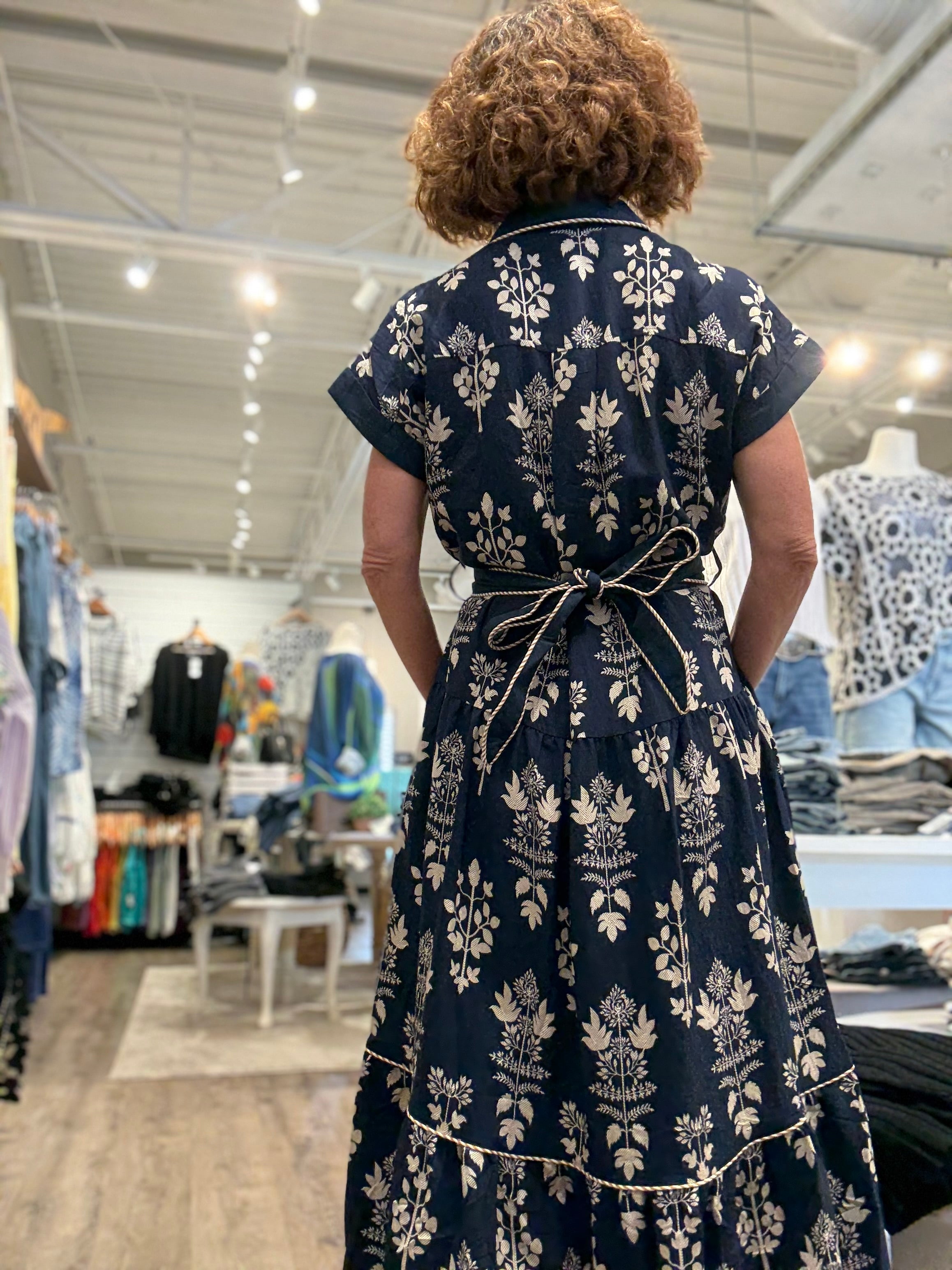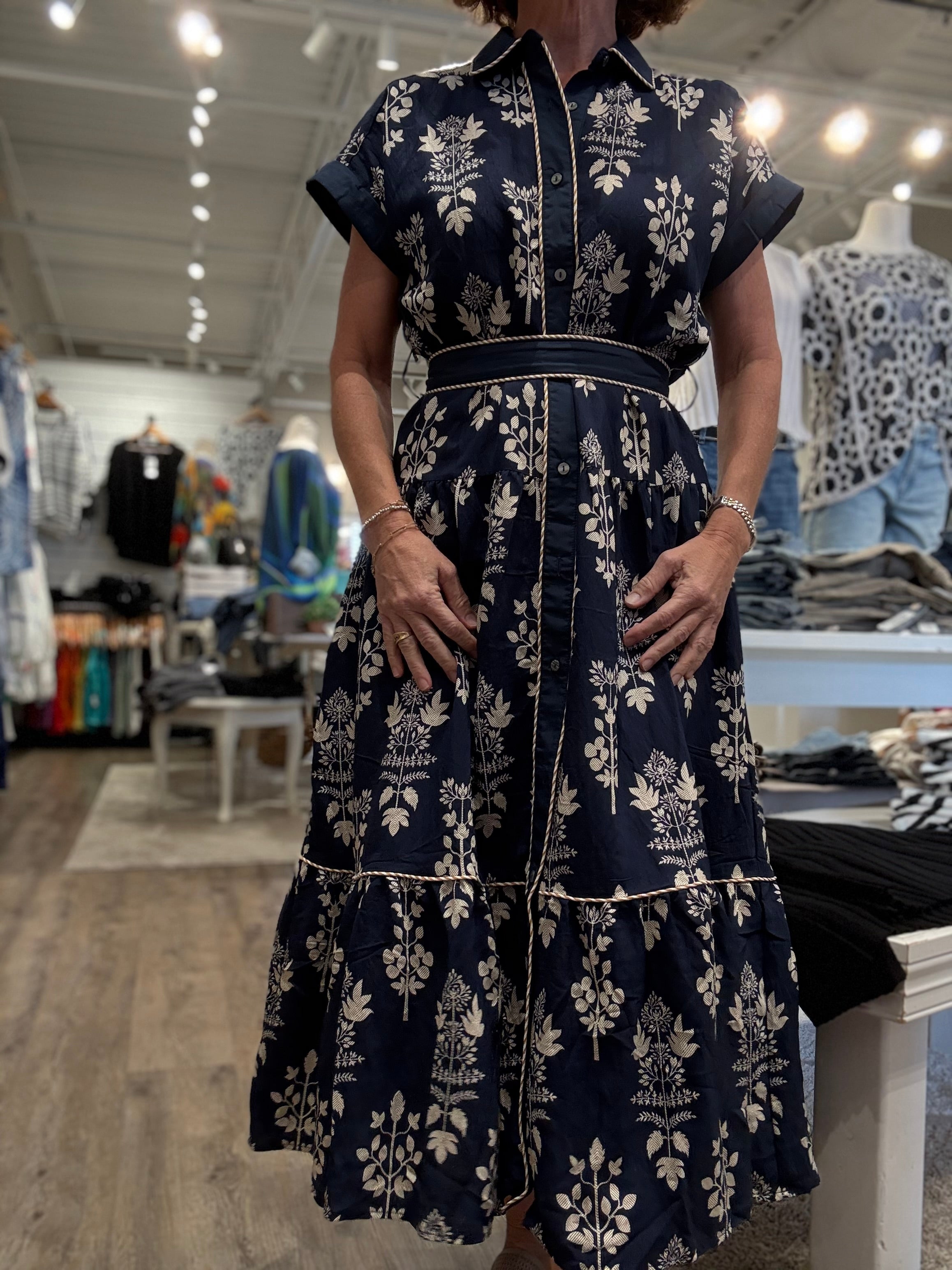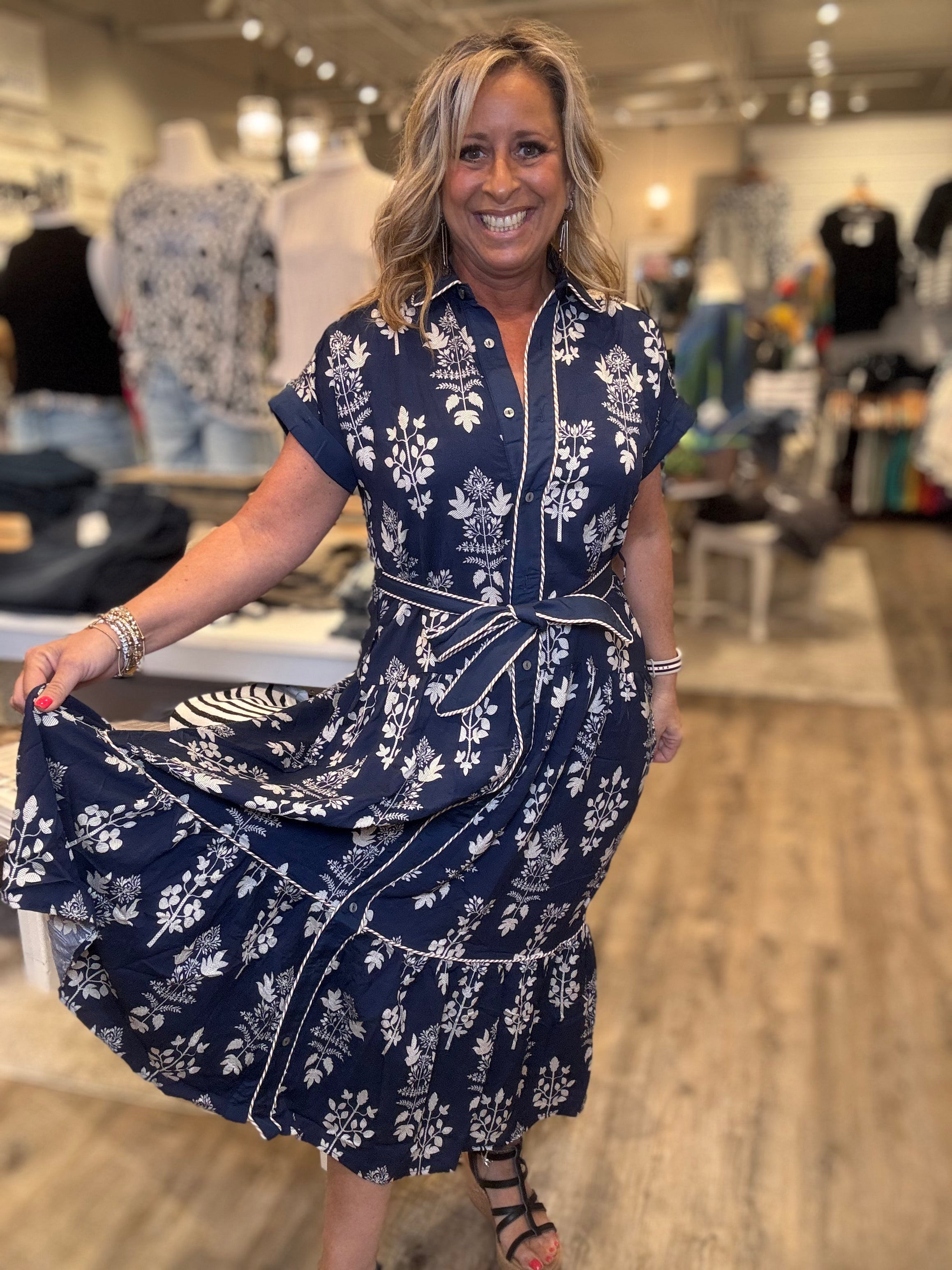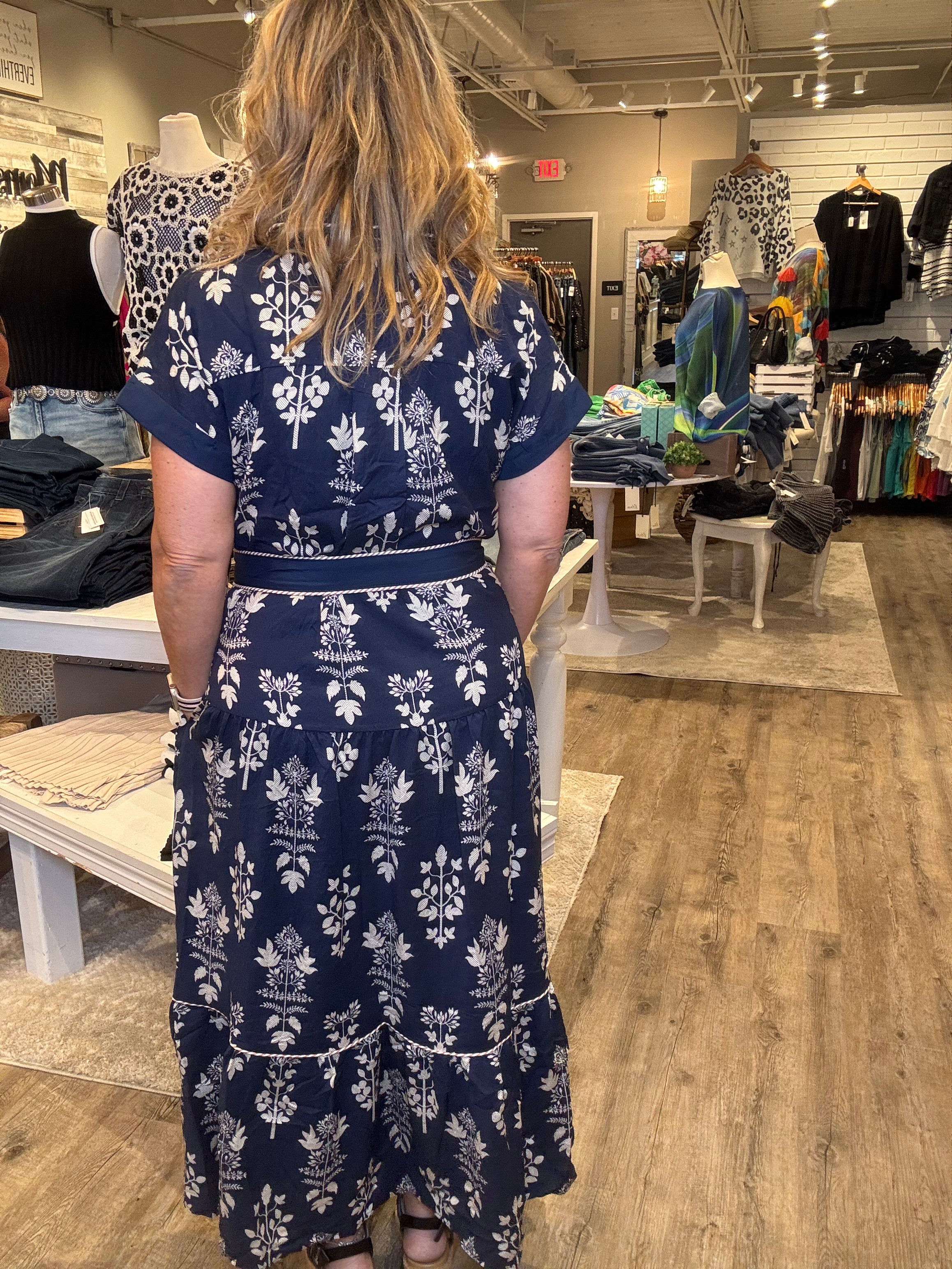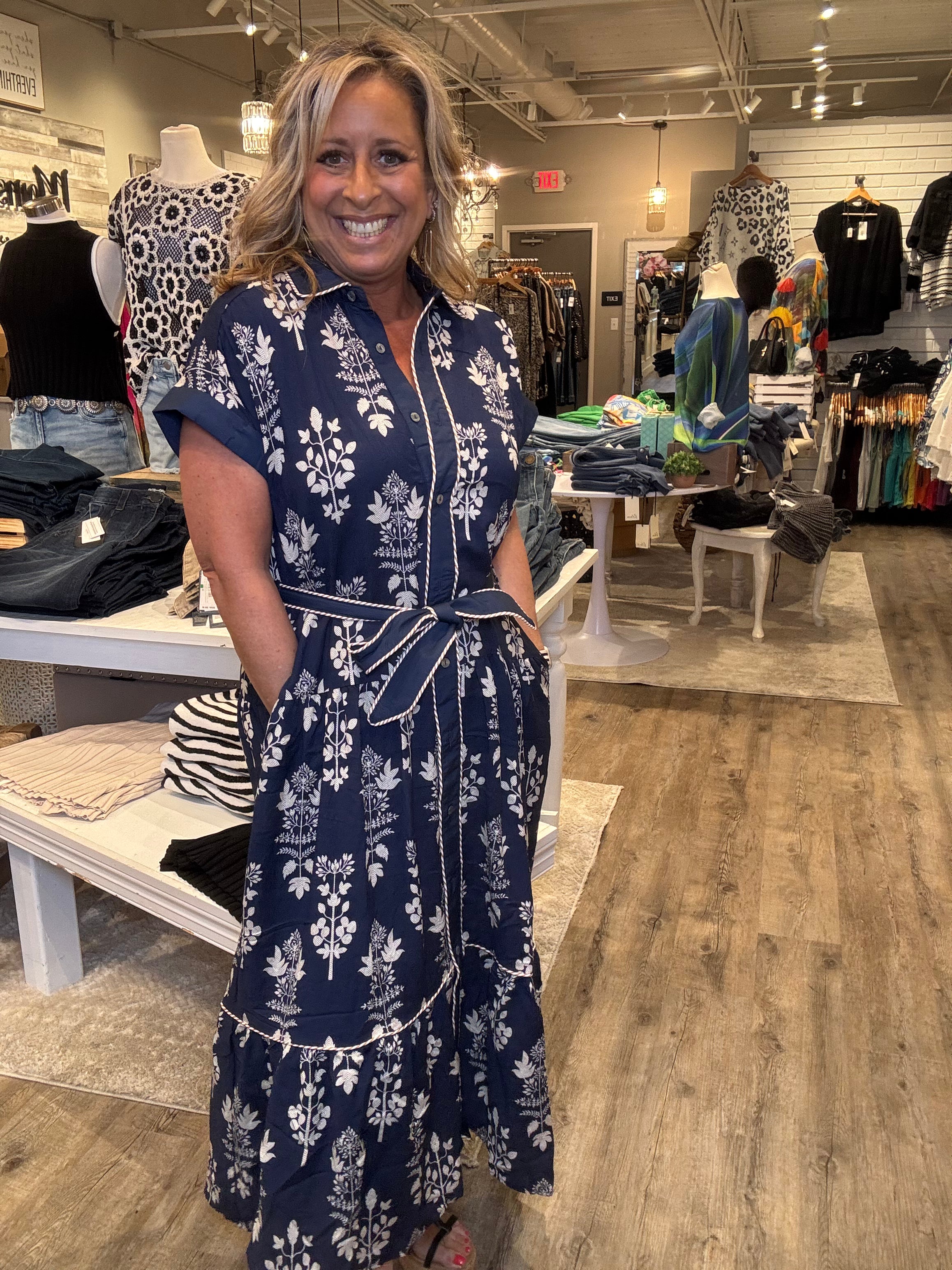 Step into effortless style with the Navy Belted Shirt Dress, a perfect blend of comfort and elegance. Featuring a crisp button-front design, short sleeves, and a flattering tie waist, this dress offers a timeless silhouette that works for any occasion. The allover white floral print adds a fresh, feminine touch, while side pockets bring everyday practicality.