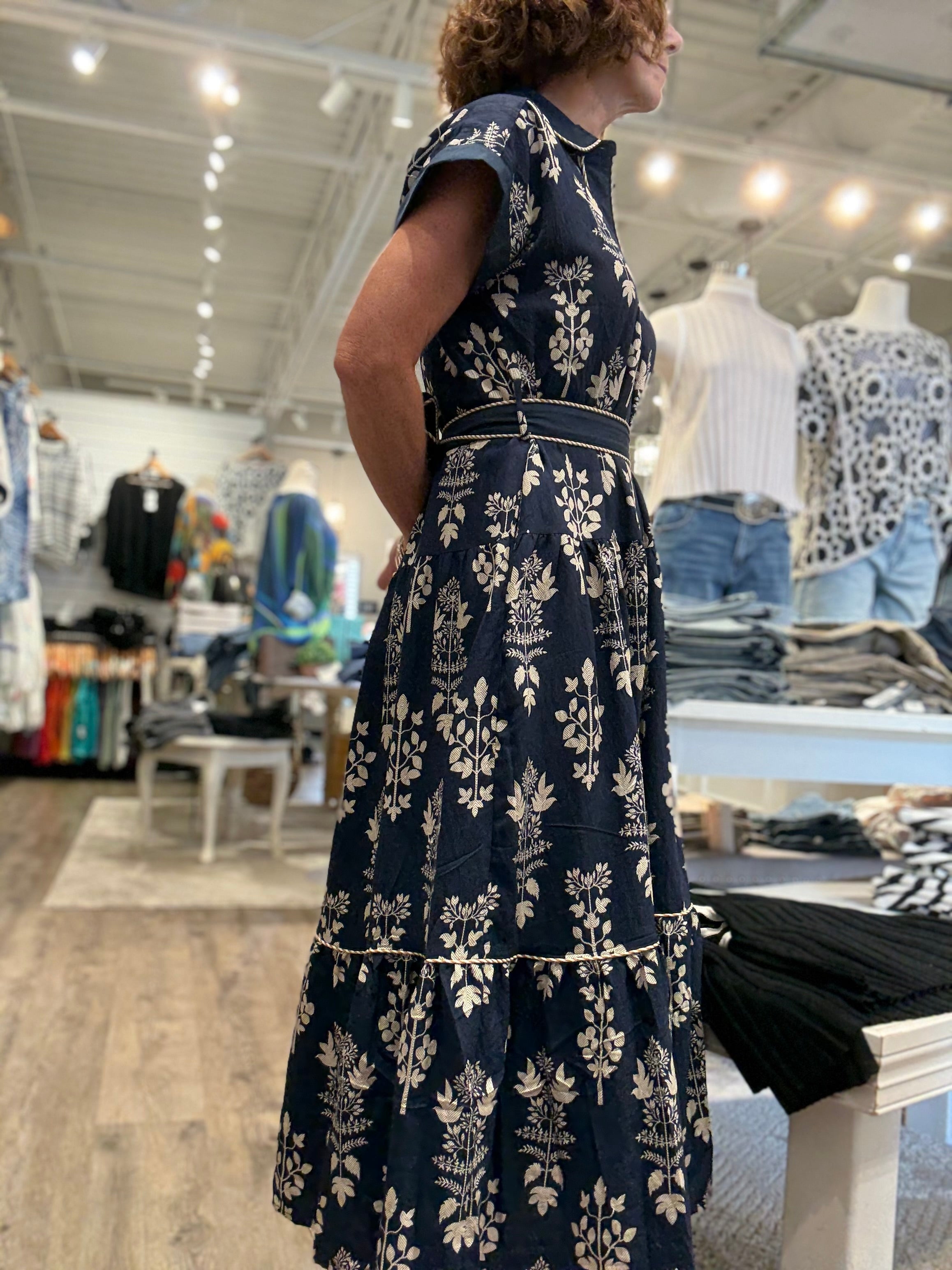 Design: Short sleeve, button-down front, tiered hemline