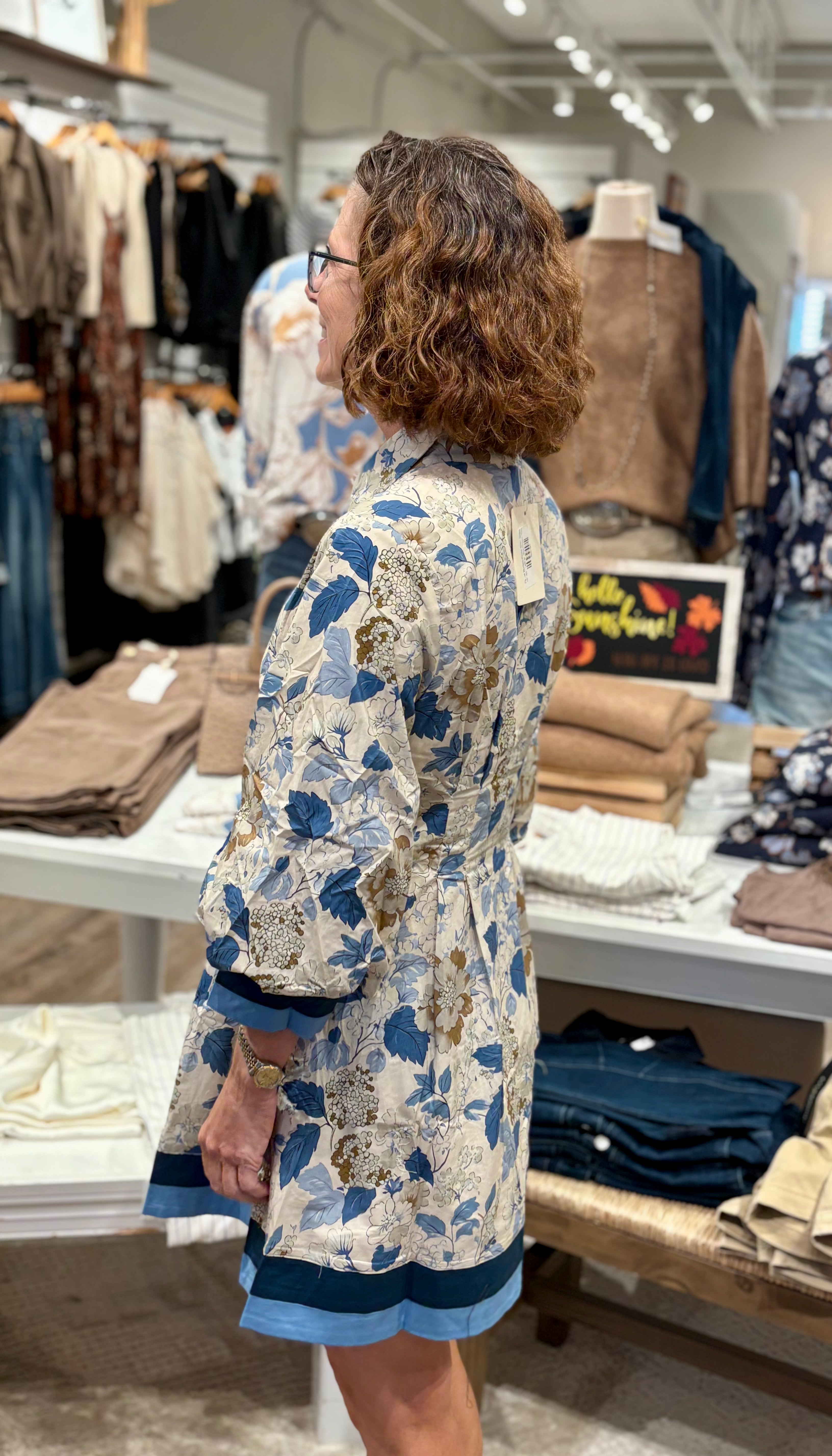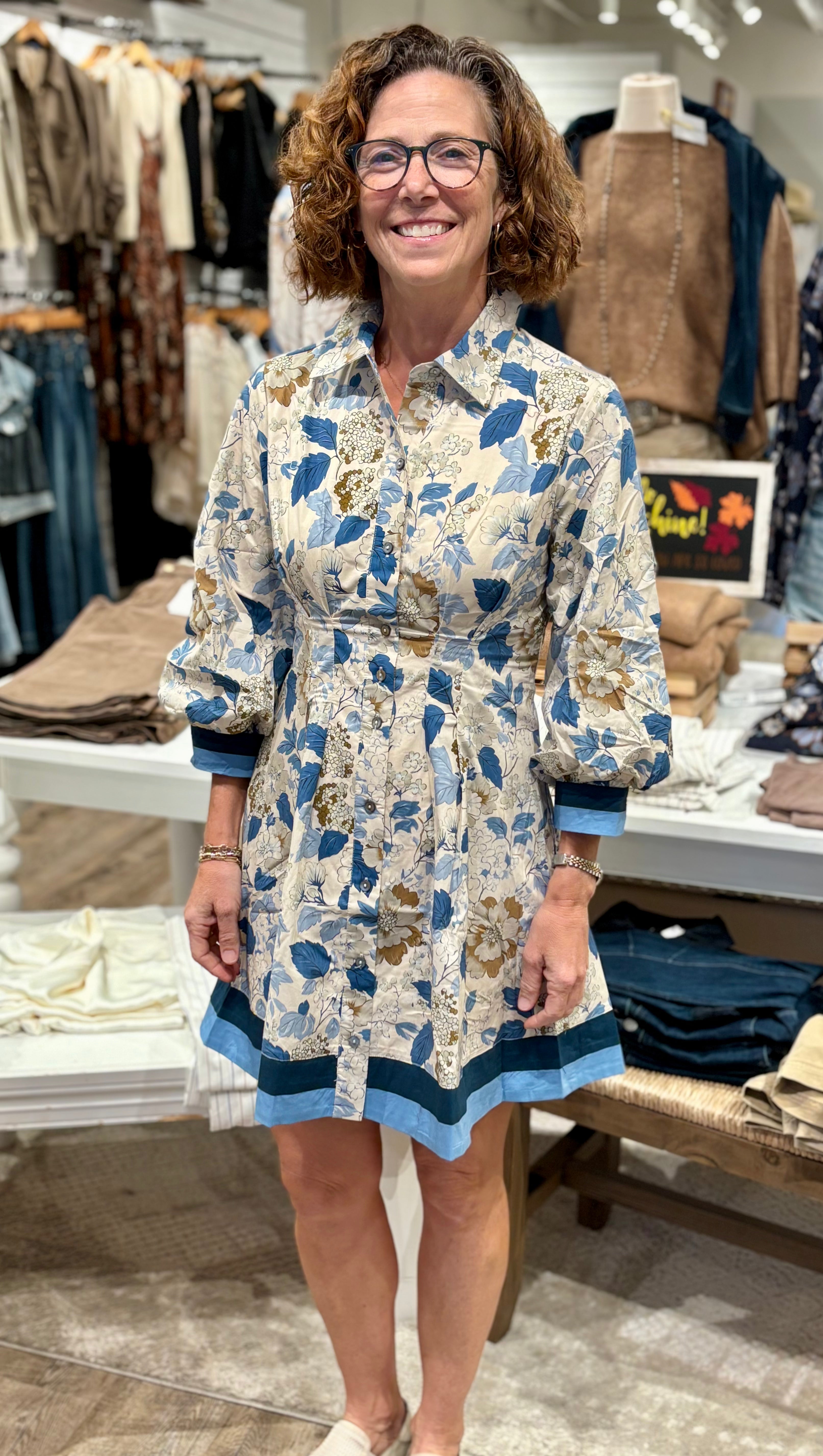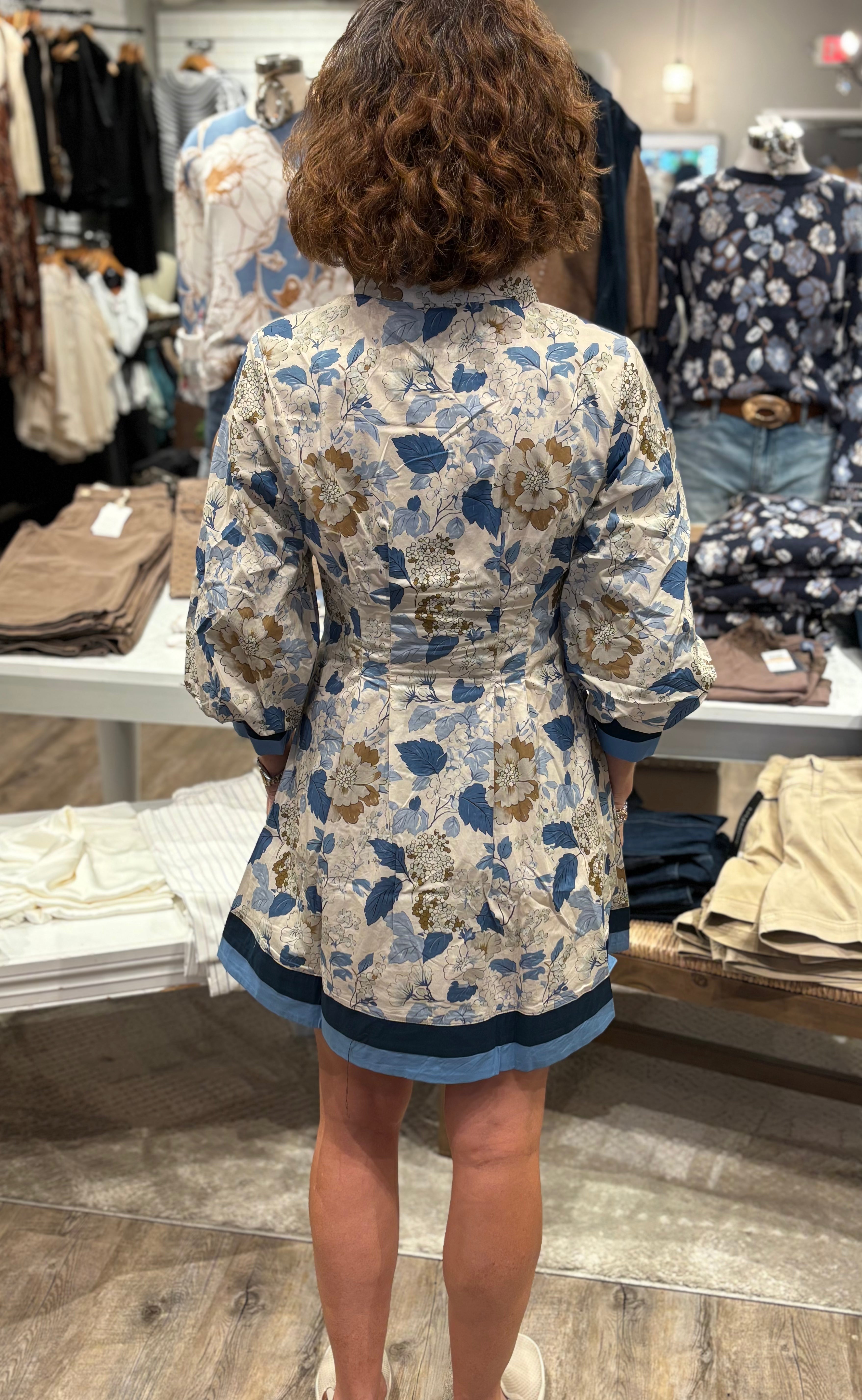 Fresh, feminine, and effortless — this floral button-front shirt dress is your new go-to for chic everyday style. Featuring a timeless collared neckline, balloon sleeves with cuff detail, and a flattering fit-and-flare silhouette, this dress is as versatile as it is stylish. The vintage-inspired floral print in soft taupe and shades of blue gives it a romantic touch, while the contrasting solid trim at the hem and cuffs adds a modern finish.