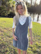 Cute, effortless, and perfect for year-round layering — our Corduroy Overall Pinafore Dress is the definition of casual-chic. Made with soft washed corduroy in a washed teal tone, this easy slip-on dress features a relaxed A-line silhouette, wide straps, and front patch pockets for that timeless, laid-back vibe.