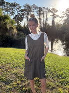 Chic, cozy, and oh-so easy to style — our Suede Pinafore Jumper Dress in olive is the perfect layering piece for fall and winter. Made from a soft suede-like fabric with a subtle textured finish, this jumper features a relaxed A-line silhouette, deep arm openings, and oversized front patch pockets for a casual-cool vibe.