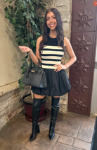 A chic mini with major mix-and-match vibes! The sleeveless striped mock neck top pairs perfectly with a solid cotton bubble hem skirt for a look that’s fun, flirty, and effortlessly polished. Perfect for brunches, outings, or just feeling fabulous.