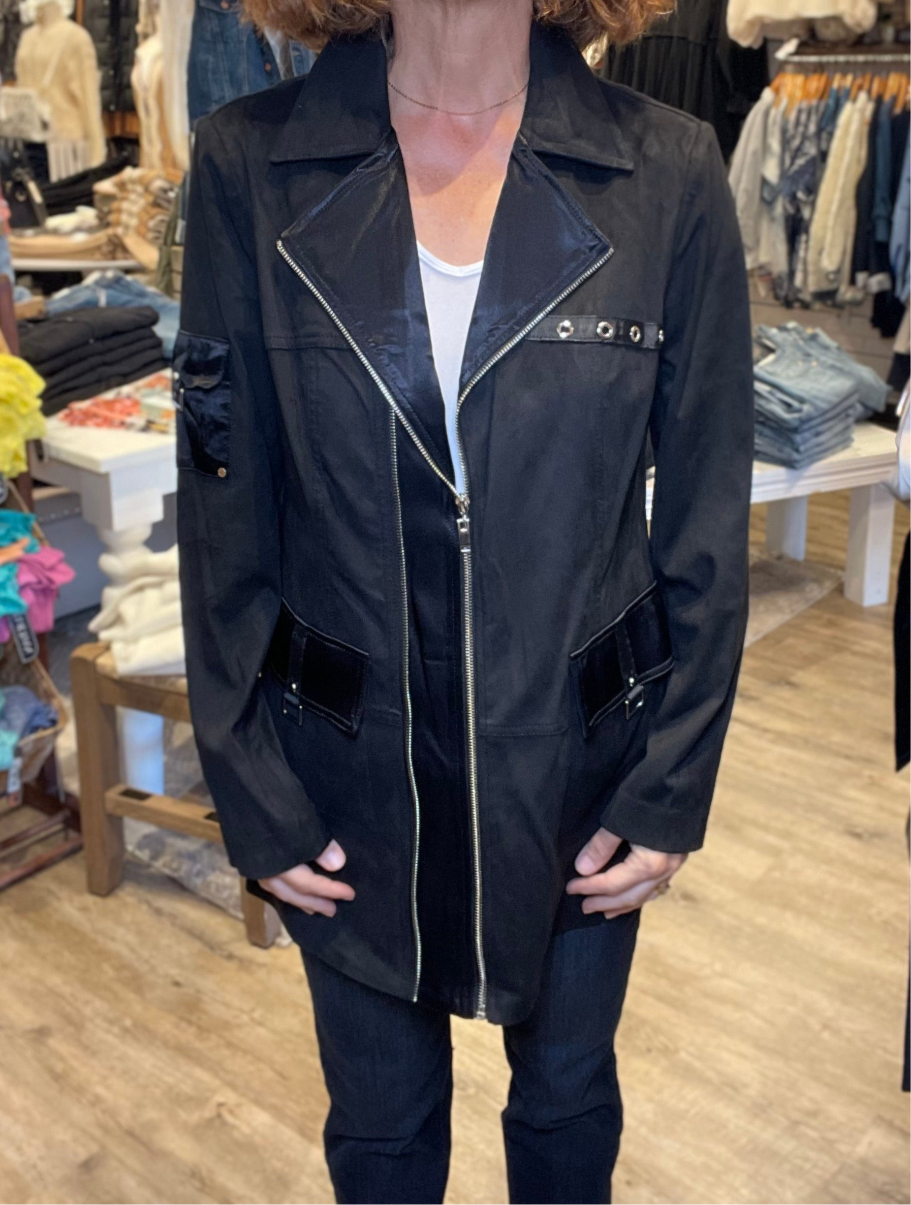 Rivet and strap details on sleeves and chest for added edge