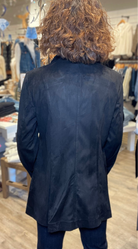 Sleek black jacket with a modern, structured silhouette