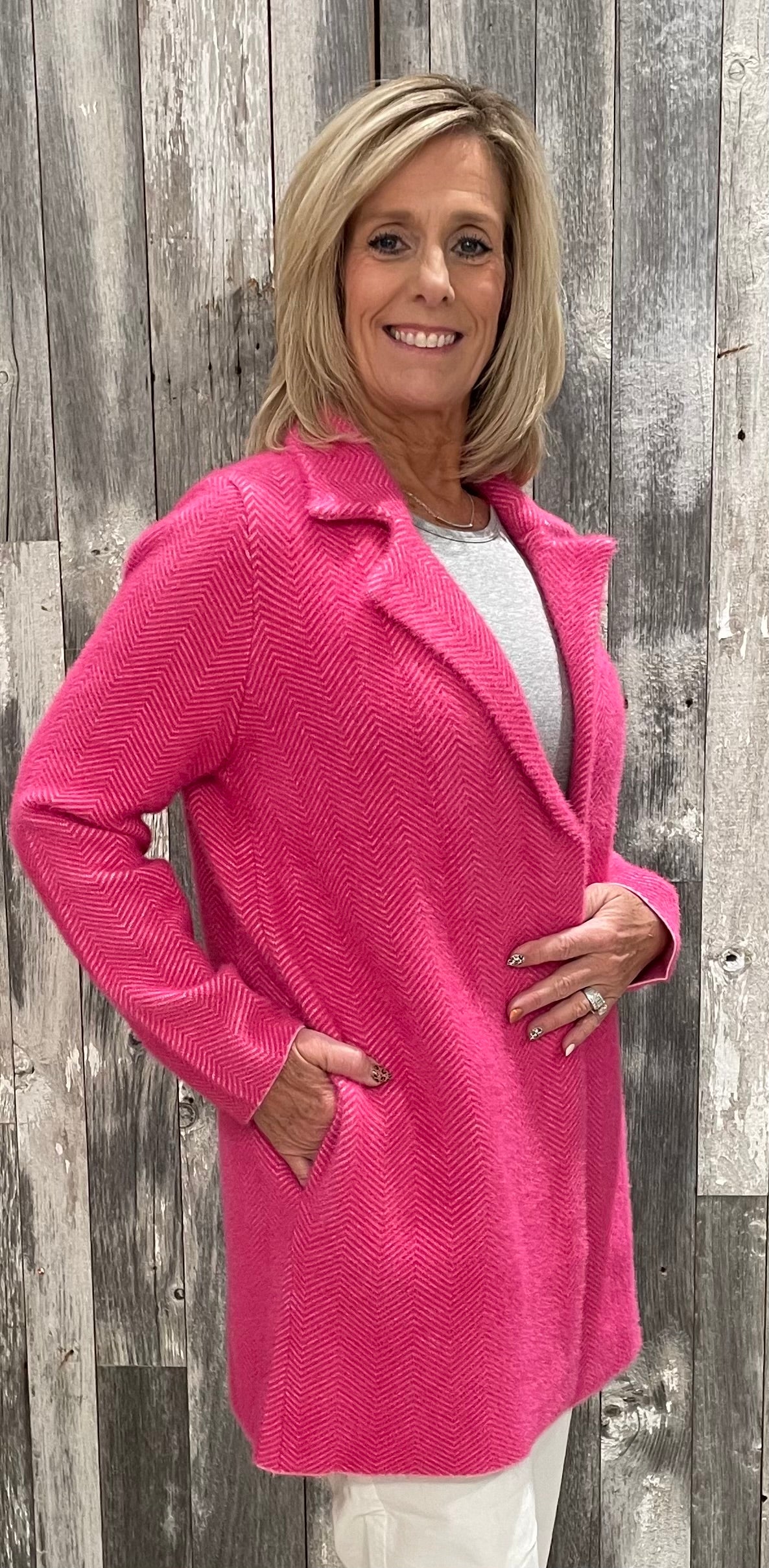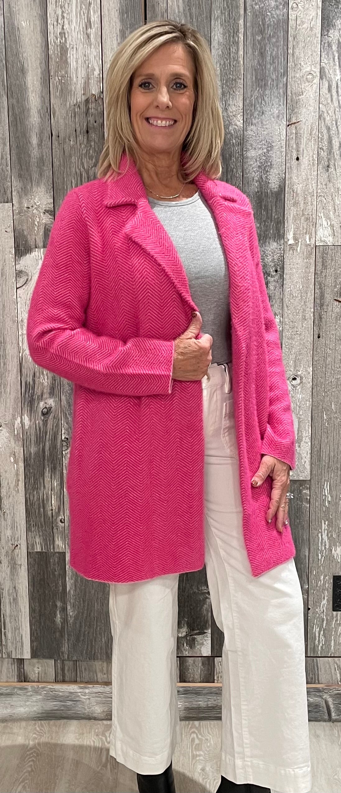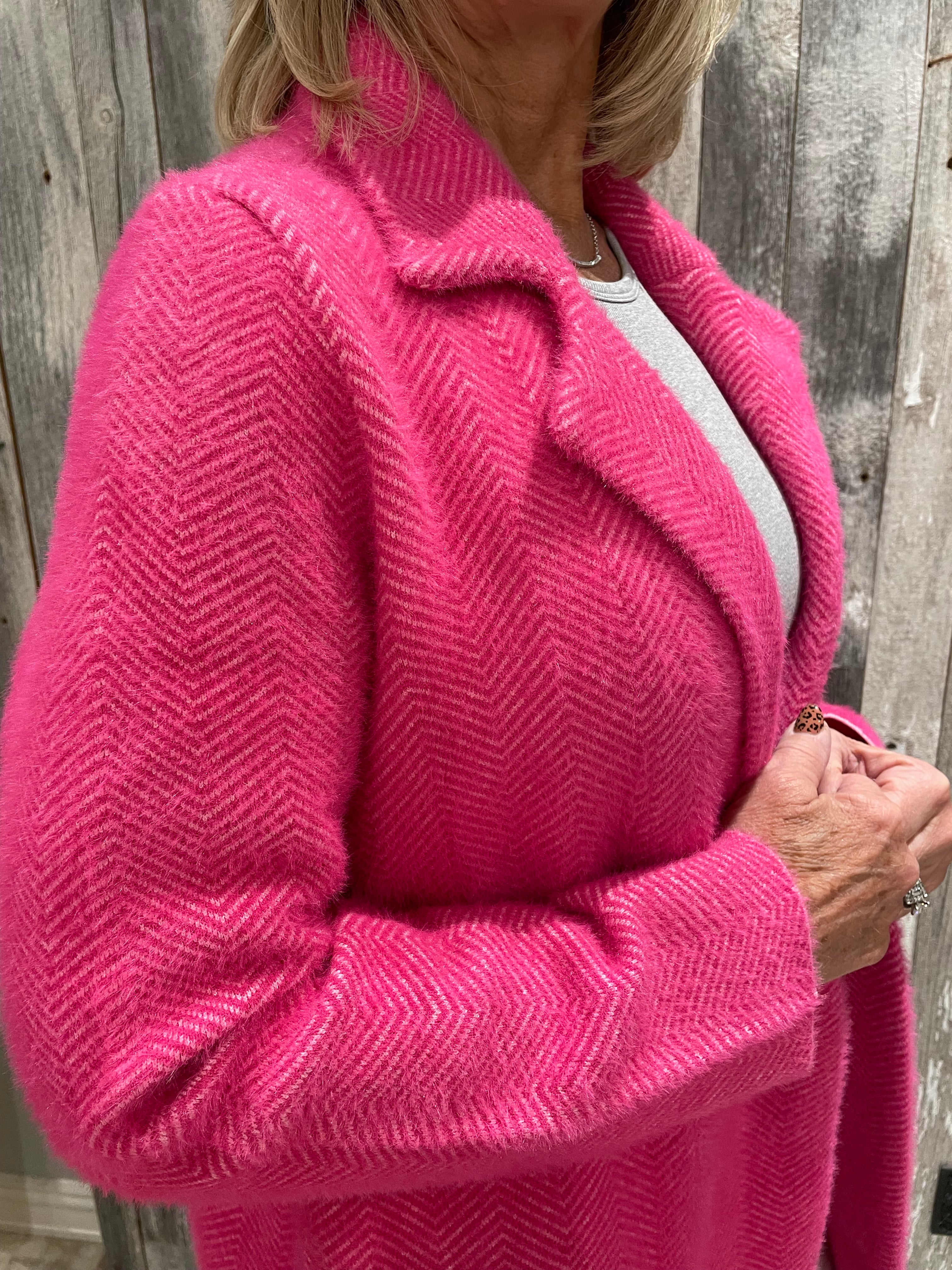 Vibrant pink longline coatigan with subtle herringbone (chevron) pattern
