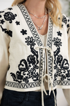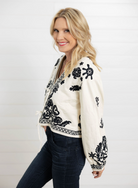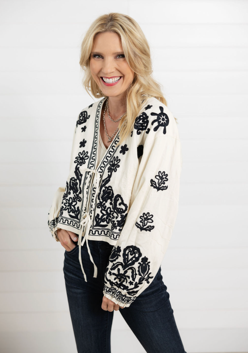 This embroidered cropped jacket is the kind of statement layer that makes even the simplest outfit feel special. Designed in a soft cream hue with bold black floral embroidery, it blends artisanal charm with modern styling. The relaxed, slightly boxy fit and adjustable drawstring hem give it that effortlessly cool, lived-in look weโre all loving right now. Lightweight and eye-catching, itโs perfect for adding texture, contrast, and personality to your everyday wardrobe.