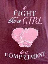 Features “To Fight Like a Girl is a Compliment” in bold pink script
