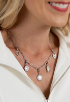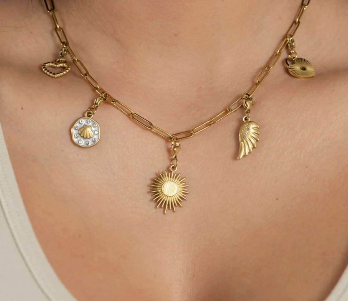 Each piece includes multiple charms—a sunburst, angel wing, heart, and medallion—adding a meaningful, boho-luxe vibe. The chain uses oversized, rectangular links for a modern touch. -