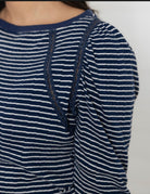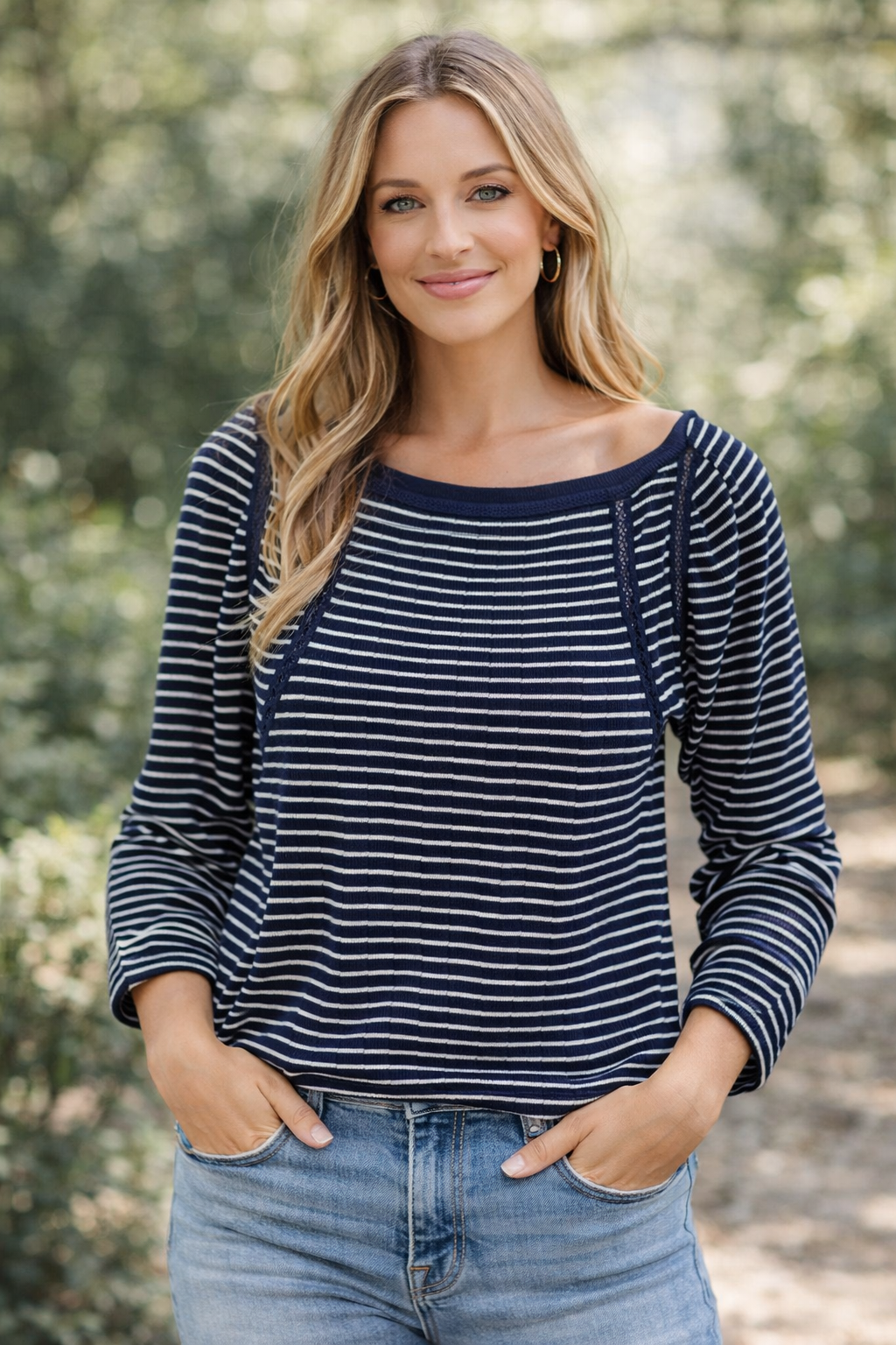 This navy striped knit top is a timeless staple with subtle elevated details that make it feel extra special. Designed with a soft, lightweight knit and delicate trim along the raglan seams, it’s effortlessly flattering and easy to wear. The relaxed fit and breathable feel make it perfect for layering or wearing solo, while the classic stripe pattern keeps it forever in style. It’s one of those women’s fashion basics that quietly pulls every outfit together.