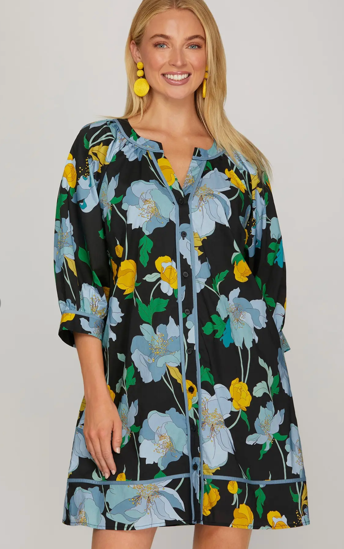 3/4 SLEEVE BUTTON DOWN FLORAL PRINT MINI DRESS WITH POCKETS