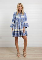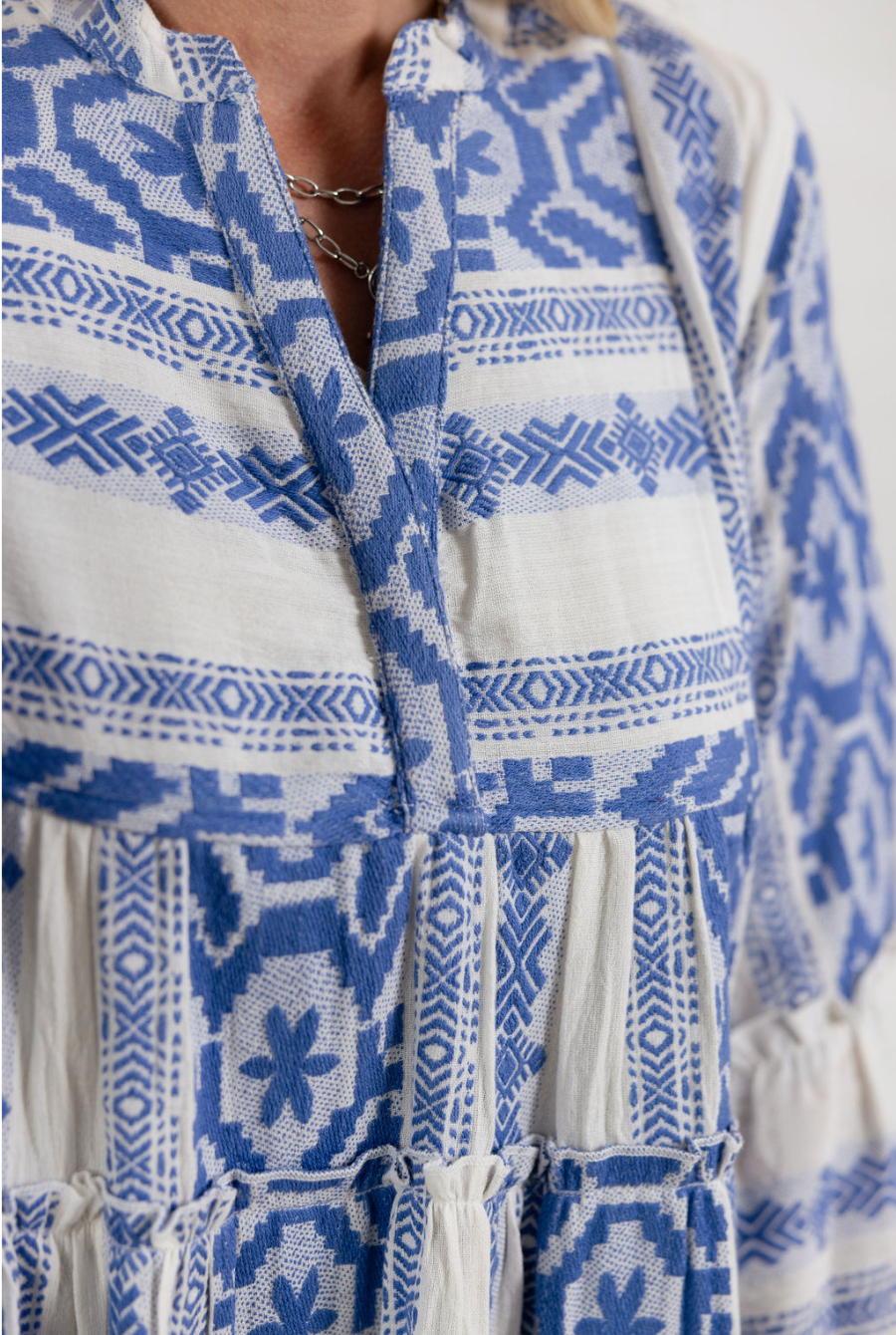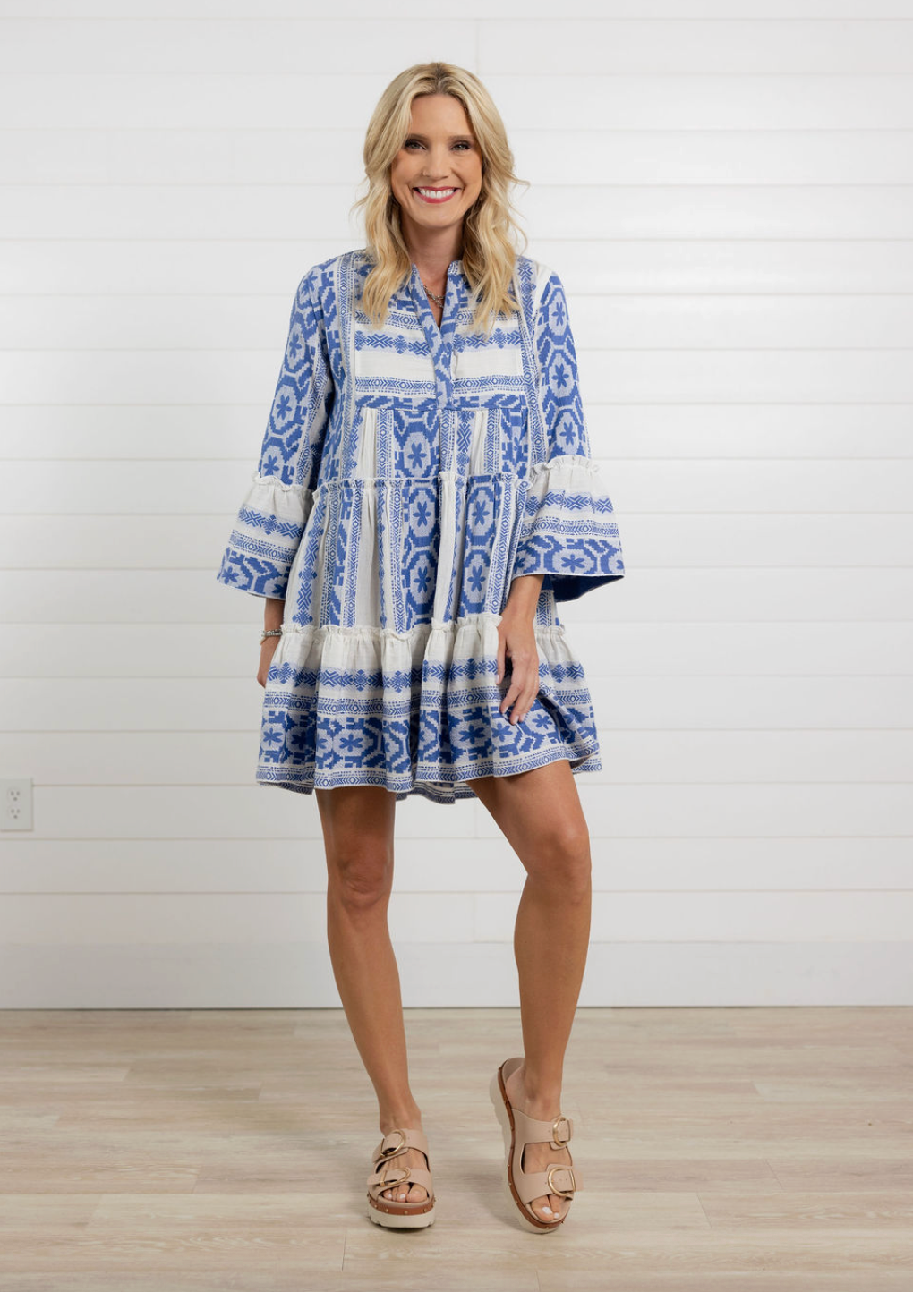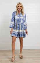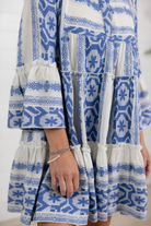 Meet your new warm-weather favorite โ€” this blue and white printed tiered dress is effortlessly charming with a relaxed, feminine feel. Featuring a flowy silhouette and playful bell sleeves, itโ€™s the kind of throw-on-and-go piece that still looks totally styled. The intricate print gives it that elevated, resort-ready vibe while the lightweight fabric keeps things comfy all day long. Perfect for brunch dates, vacation strolls, or soaking up sunshine close to home.