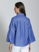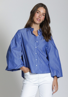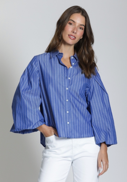 Classic with a statement twist, this blue pinstripe button-down features dramatic balloon sleeves for a modern, elevated look. Polished enough for work yet bold enough for dinner plans, this top brings effortless sophistication to any outfit.