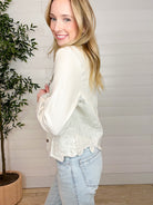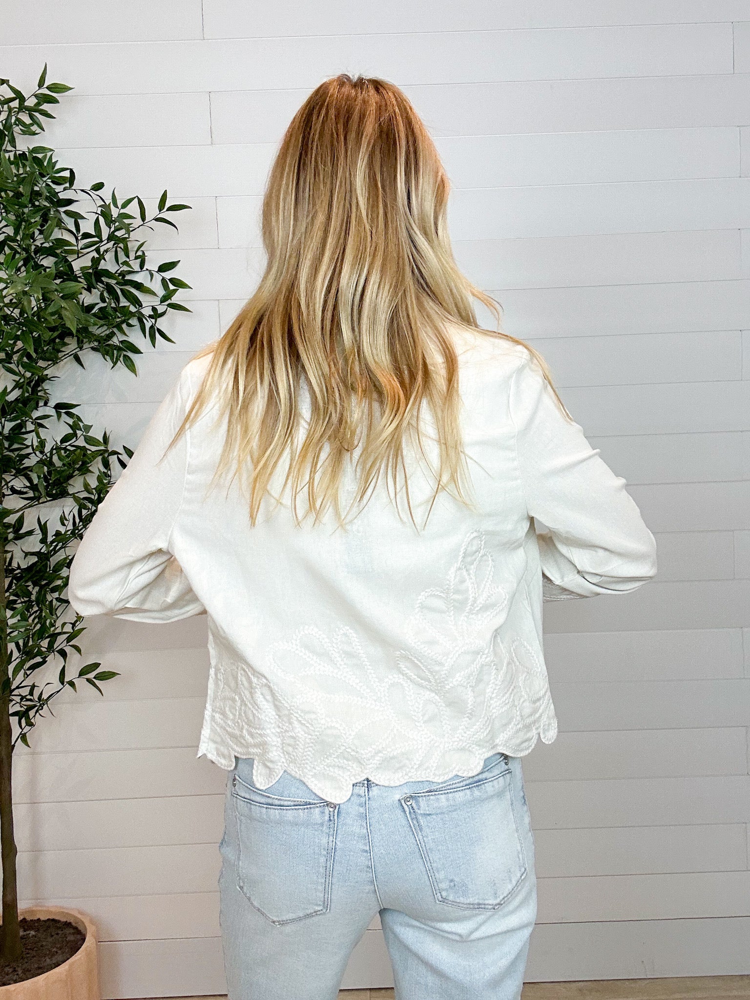 Elevate your layering game with this beautifully detailed neutral jacket. Designed with delicate embroidery and a flattering cropped fit, this piece adds texture and sophistication to any outfit.