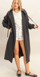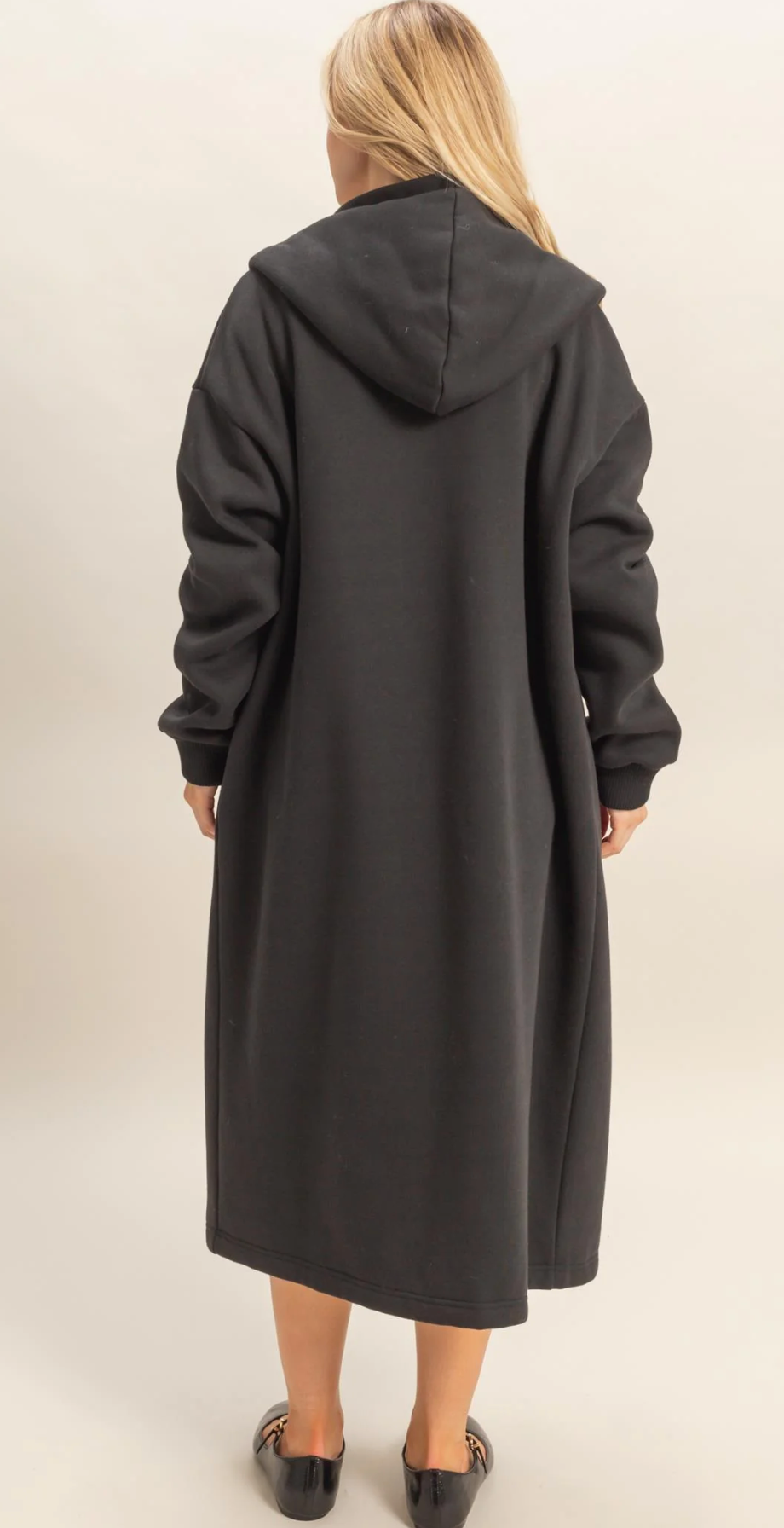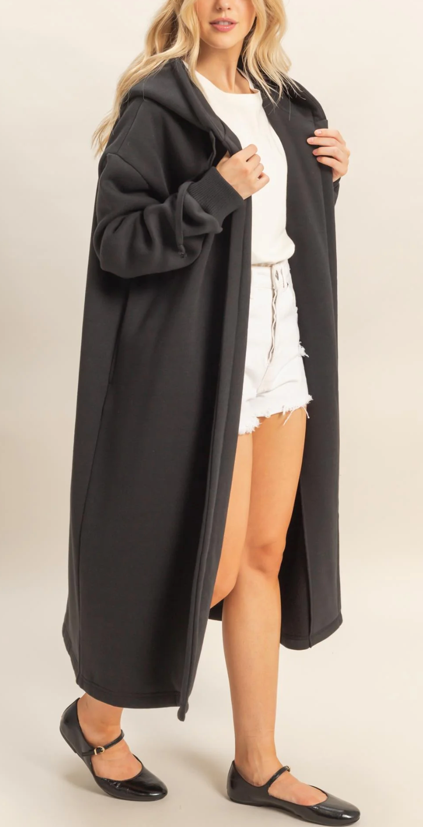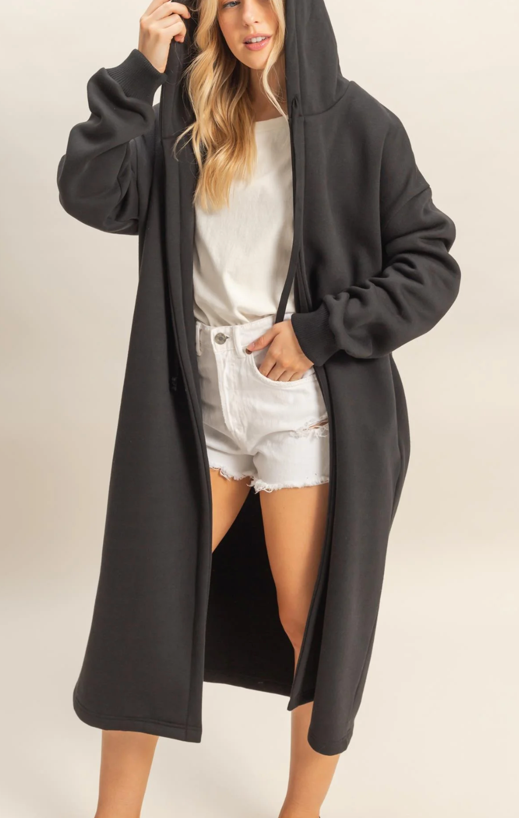 Meet your new layering essential — this longline hoodie coat blends comfort, warmth, and effortless street-chic style. Designed with an oversized fit and made from a soft, cozy fleece-lined fabric, this piece is perfect for throwing on over leggings, denim, or even your favorite lounge sets. With its dramatic length and relaxed silhouette, it’s a must-have for transitional weather and everyday wear.