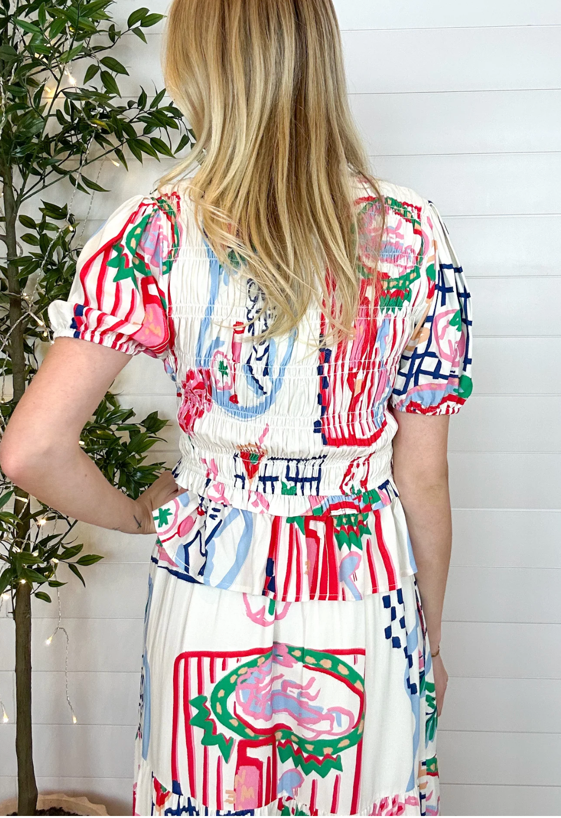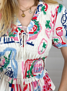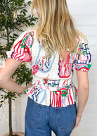 Say hello to theĀ Italiano Sketch Peplum TopĀ ā the whimsical sister to our beloved tiered dress. With its smocked bodice, flattering V-neckline, and breezy puff sleeves, this meet-and-greetālength cutie brings boutique charm with an artsy twist. The multicolor doodle print features fruit, picnic spreads, sea creatures, and Michelangeloās David (because whyĀ notĀ be cultured and cute?). A delicate neckline ruffle and decorative tie add that perfect feminine finish, while the tulip hemline gives a soft, flattering shape over jeans, shorts, or skirts.