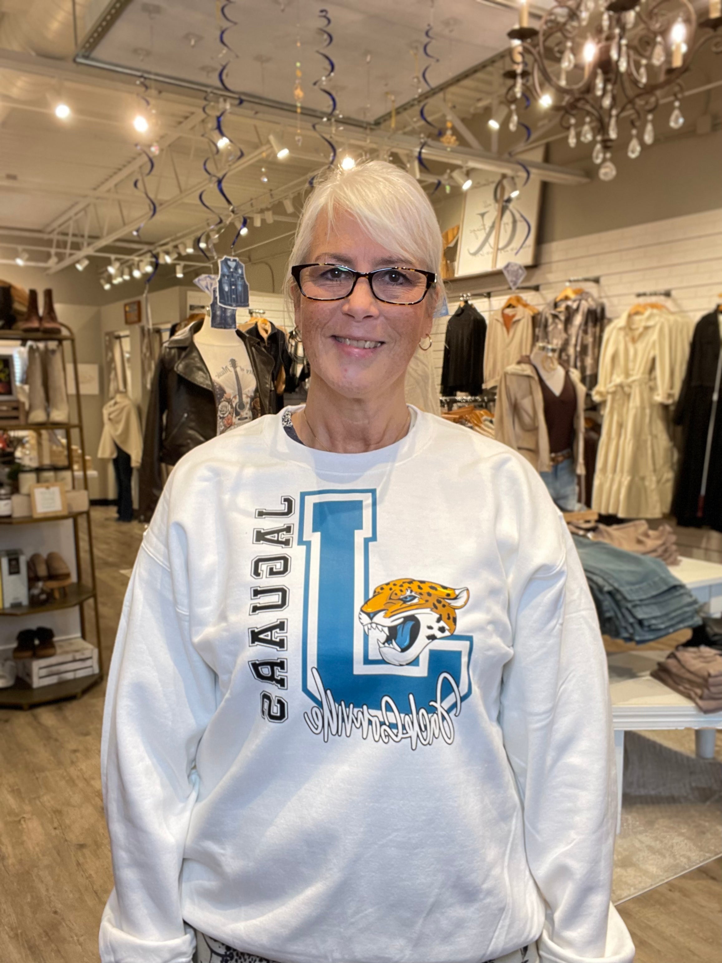 Show your team pride in cozy style with this Jacksonville Jaguars graphic sweatshirt. Designed in a crisp white with bold teal and gold team graphics, this sweatshirt is perfect for game days, casual outings, or layering for everyday wear. Soft on the inside and stylish on the outside, it’s a must-have for any Jags fan.