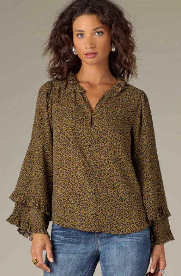 Features flowy tiered ruffle sleeves for a feminine touch and a split neckline for an effortlessly flattering silhouette.