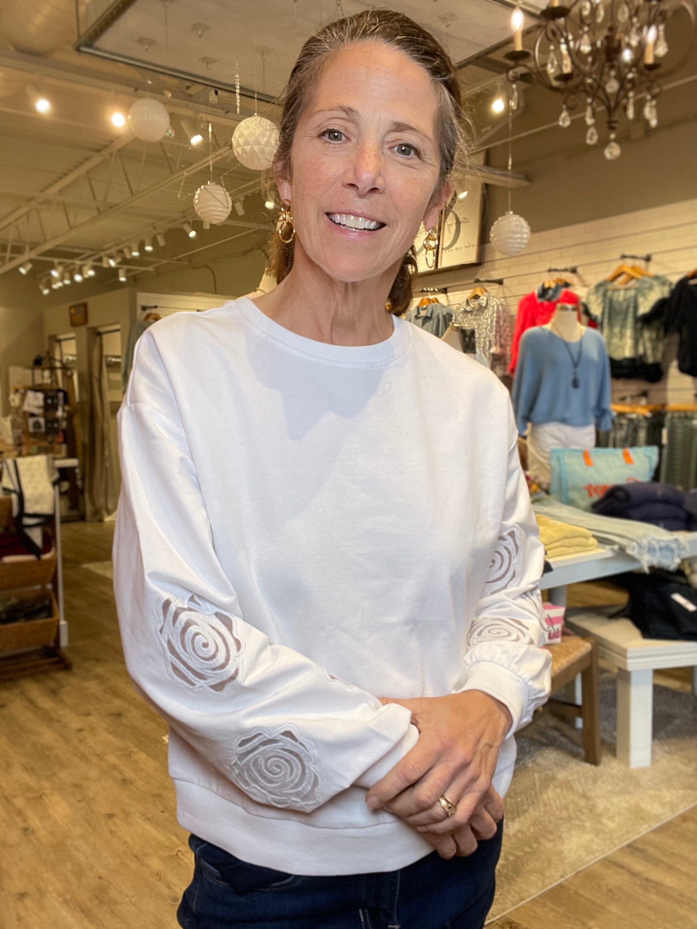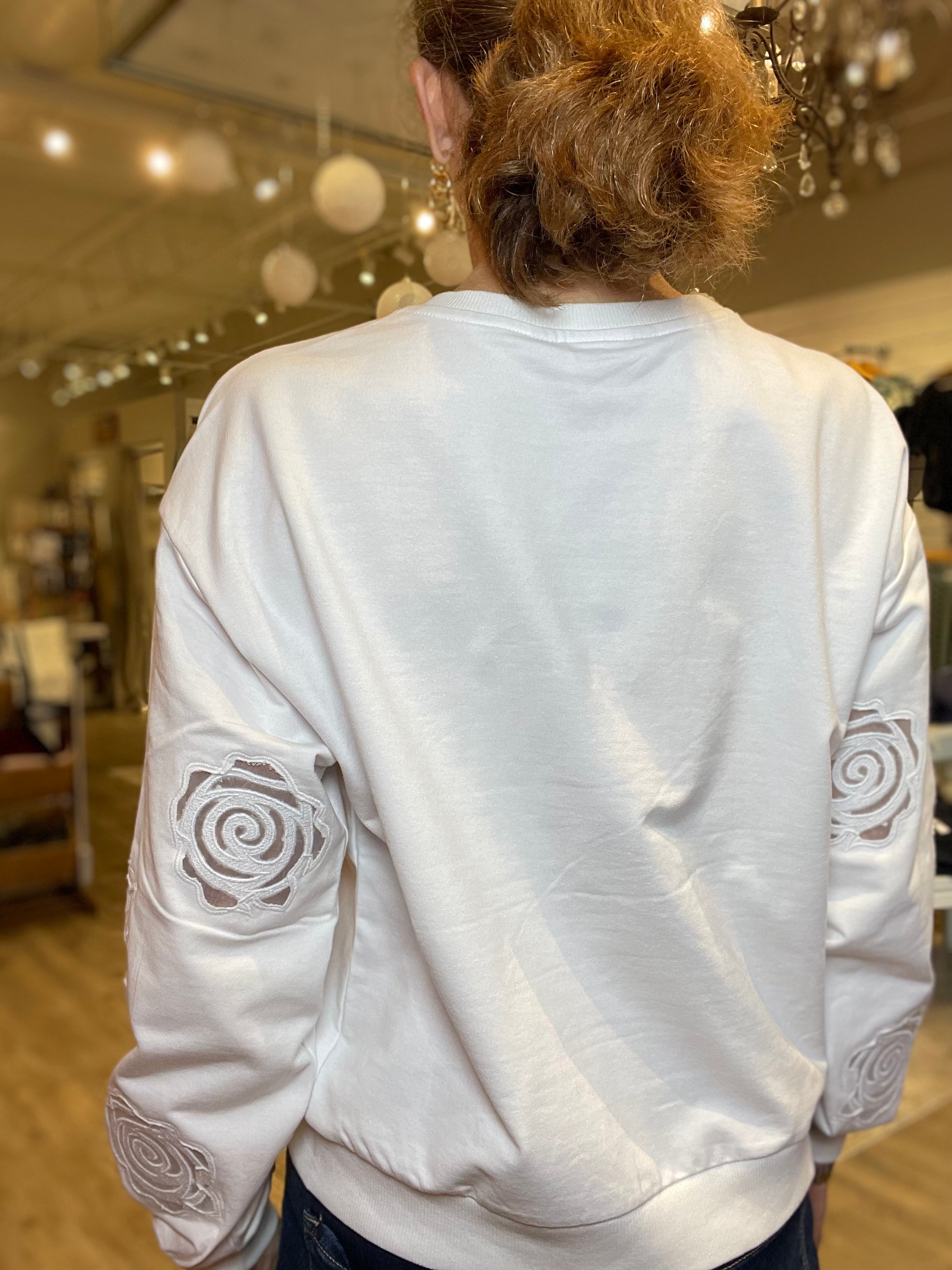 The Rose Detail Sweatshirt is a fresh take on an everyday essential. Designed with a relaxed fit and clean silhouette, this piece stands out with delicate raised floral detailing along the sleeves for just the right amount of interest. The soft, cozy fabric makes it perfect for layering or wearing on its own, while the neutral cream color keeps it versatile and timeless. Easy, comfortable, and quietly elevated β this is the kind of sweatshirt that feels special without trying too hard.