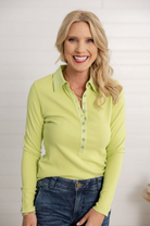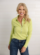 Classic and versatile, our Ribbed Long Sleeve Henley Top is an everyday essential with a polished touch. Featuring a slim ribbed fit, collared neckline, and button-front placket, this top balances comfort with effortless style. Perfect on its own or layered, it’s a go-to piece that can be dressed up or down with ease. Available in Chartreuse.