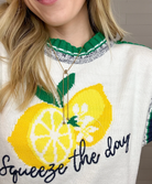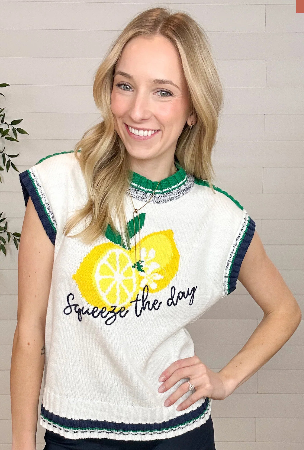 The “Squeeze the Day” Lemon Sweater Vest is pure feel-good style with a polished twist. Designed with a creamy knit body, this classic-length sweater vest features a cheerful intarsia lemon graphic paired with the embroidered phrase “Squeeze the Day” front and center. Navy and kelly green striped hems add a crisp, preppy finish that balances the playful design beautifully. Soft, lightweight, and endlessly layerable, it’s the perfect piece to brighten up your everyday looks.