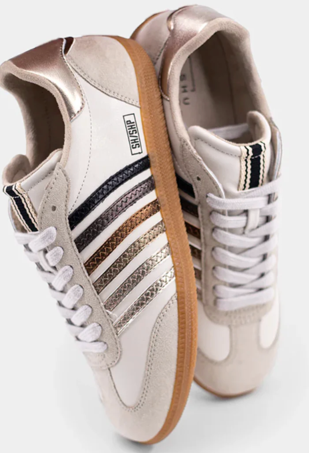 • Sporty Luxe Look: Classic low-top sneaker with metallic multi-stripe detail.