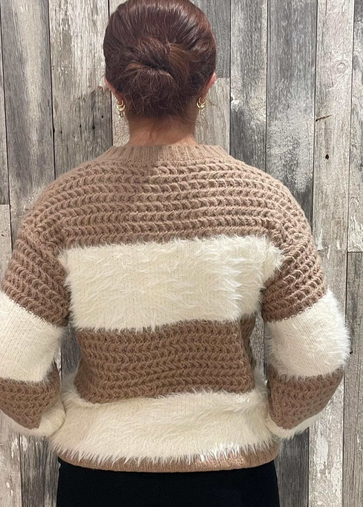 Cozy up in style with this chunky stripe textured sweater. Featuring alternating mocha and cream bands in a mix of classic knit and fuzzy textures, this sweater is as eye-catching as it is comfortable. The crew neckline and relaxed silhouette make it a versatile piece that pairs easily with denim, trousers, or skirts for effortless seasonal style.