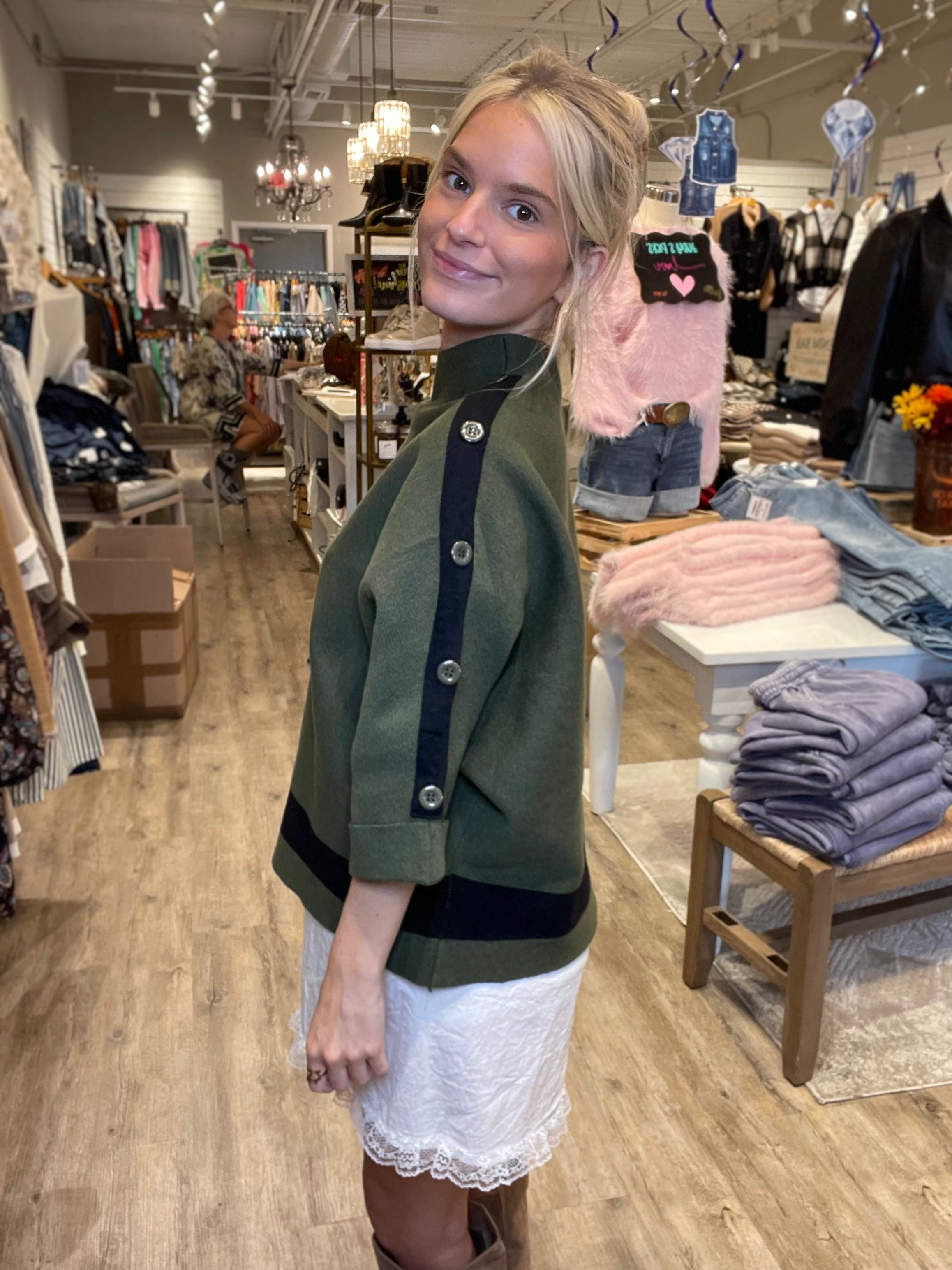 Effortlessly chic and modern, this structured mock neck sweater is a standout layering piece. Designed in a rich olive green with a bold black stripe along the hem and subtle button accents on the shoulders, it brings a touch of sophistication to everyday wear. The boxy fit and cropped length make it easy to pair with skirts, denim, or tailored pants.