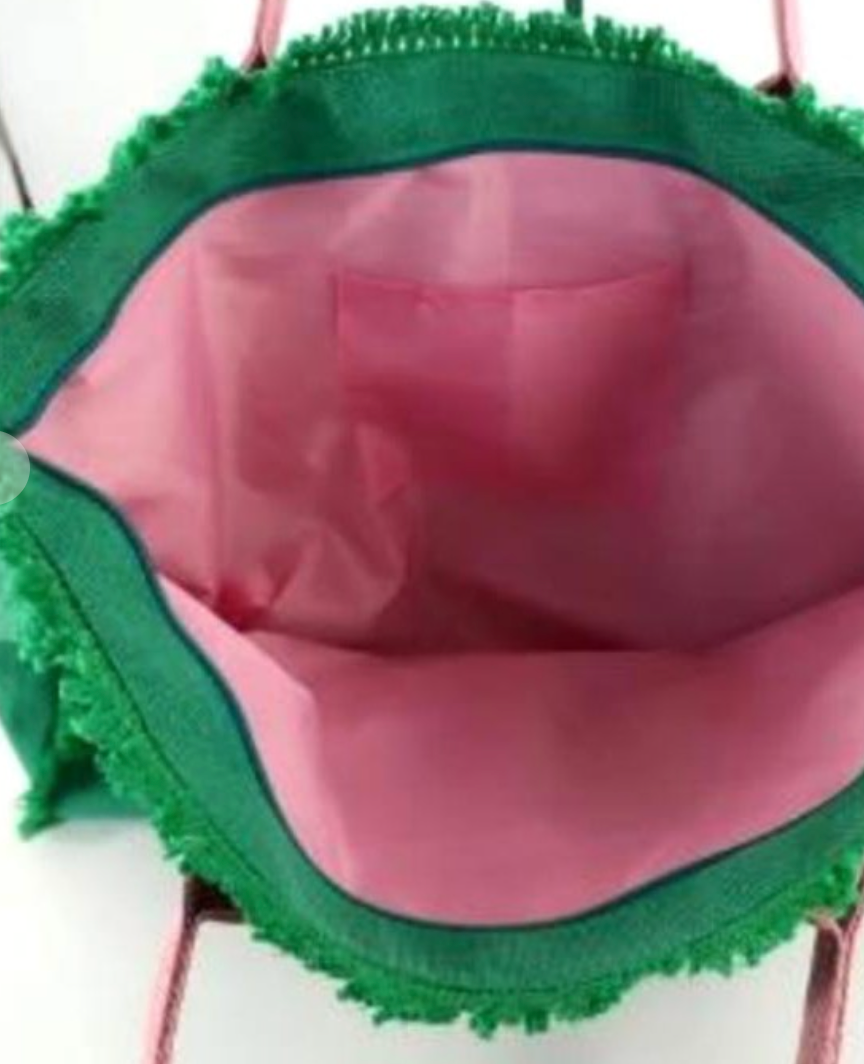 Finished with frayed edge detailing and sturdy contrast handles, it’s roomy enough to hold towels, sunscreen, snacks, and all your warm-weather essentials—while still looking effortlessly chic.