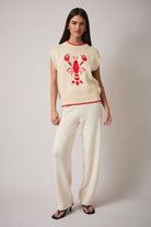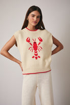 This lobster knit sweater vest is serving major seaside charm with a fashion-girl edge. The bold red lobster graphic pops against the creamy neutral knit, making it a standout piece that still feels classic and wearable. With its sleeveless silhouette and cozy-but-lightweight feel, it’s perfect for layering or wearing solo when you want your outfit to do the talking. Equal parts fun and polished — this one’s a total conversation starter in women’s fashion circles.