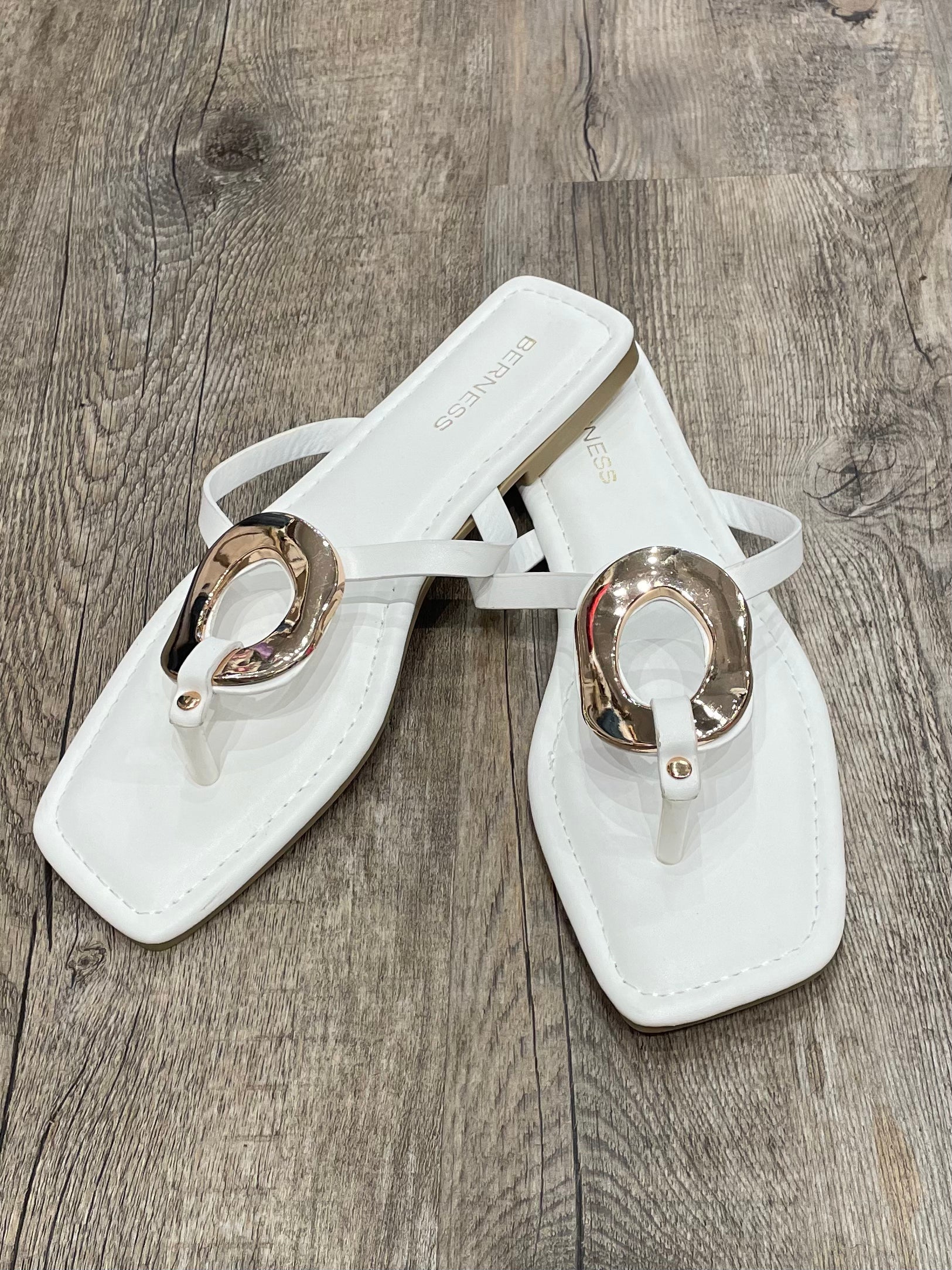 These chic white slide sandals are the definition of effortless summer style. Designed with a sleek square toe and a modern gold-tone statement ring, they instantly elevate everything from breezy sundresses to your favorite cropped denim. The minimalist silhouette keeps things fresh and on-trend, while the easy slip-on design makes them a grab-and-go staple for warm-weather days. Think vacation vibes, patio brunches, and sunshine-filled strolls.