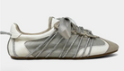 Step into standout style with this feminine-meets-sporty sneaker. Featuring soft neutral tones, shimmering accents, and a statement satin bow, this shoe brings elevated charm to your everyday look.