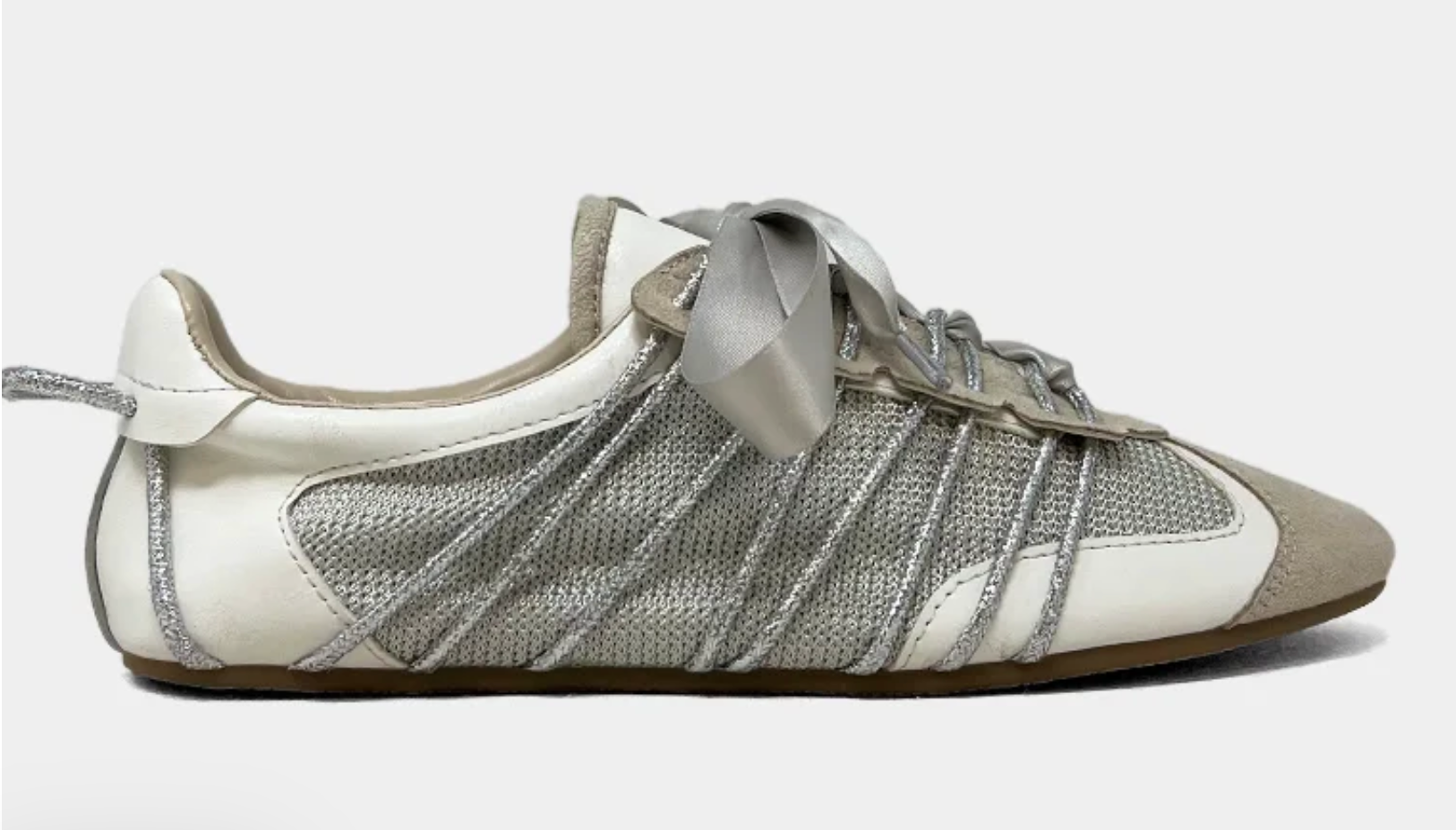 Delicate yet grounded, SHERYL in Light Grey gives the ballet sneaker a fresh, airy upgrade. Featuring soft mesh panels, light faux suede, and tonal silver accents, this pair captures subtle elegance with a sporty edge. Finished with satin laces and a flexible sole, it’s an effortless pick for everyday chic.