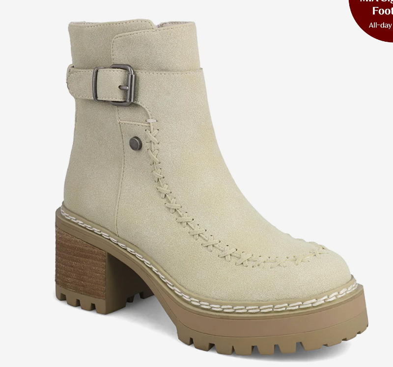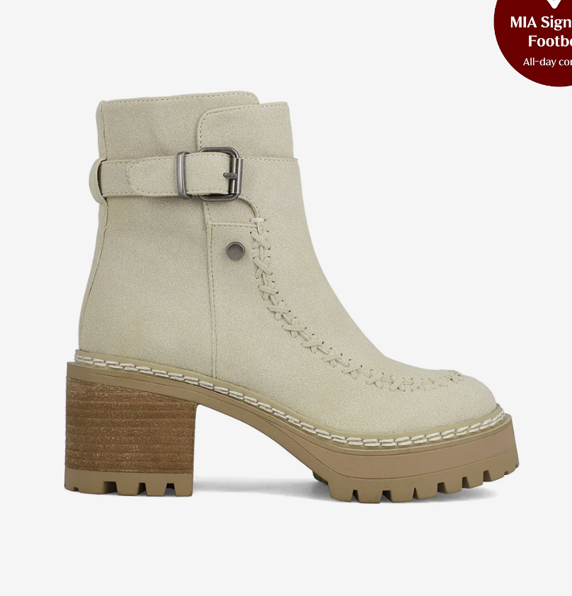 Step into fall with the perfect blend of comfort and style. The Sierra Suede Bootie features a soft neutral tone, detailed whipstitch accents, and a sturdy stacked heel for effortless everyday wear. Designed with a side buckle strap and treaded sole, this boot brings elevated edge to any look — from jeans to dresses.