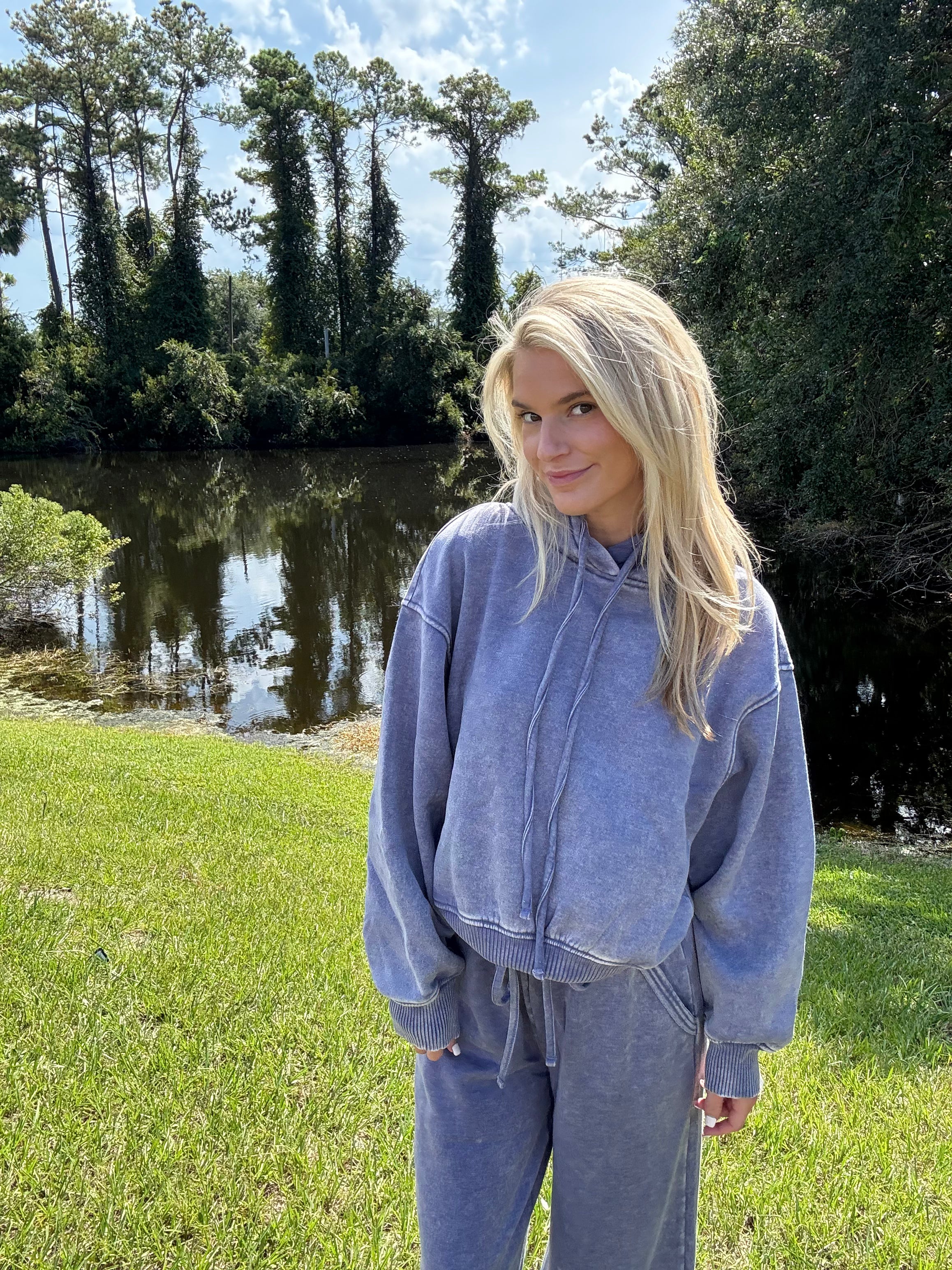 Cozy hoodie in a soft washed marlin blue shade