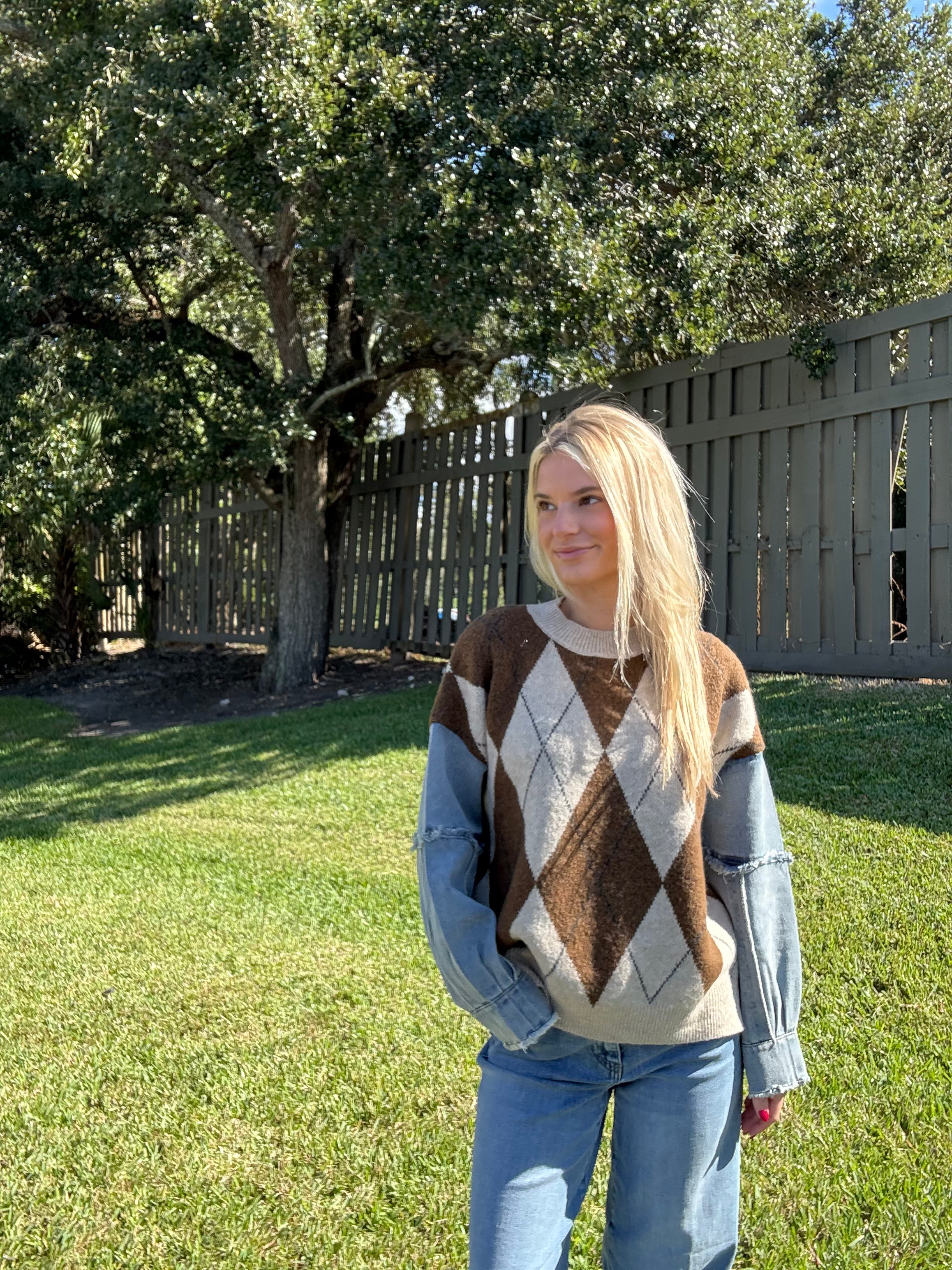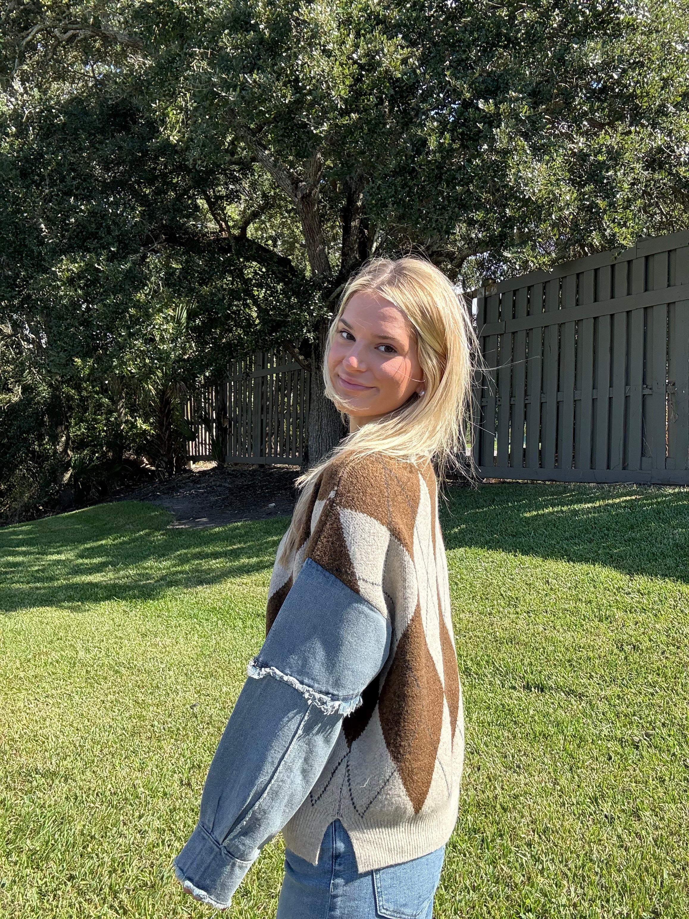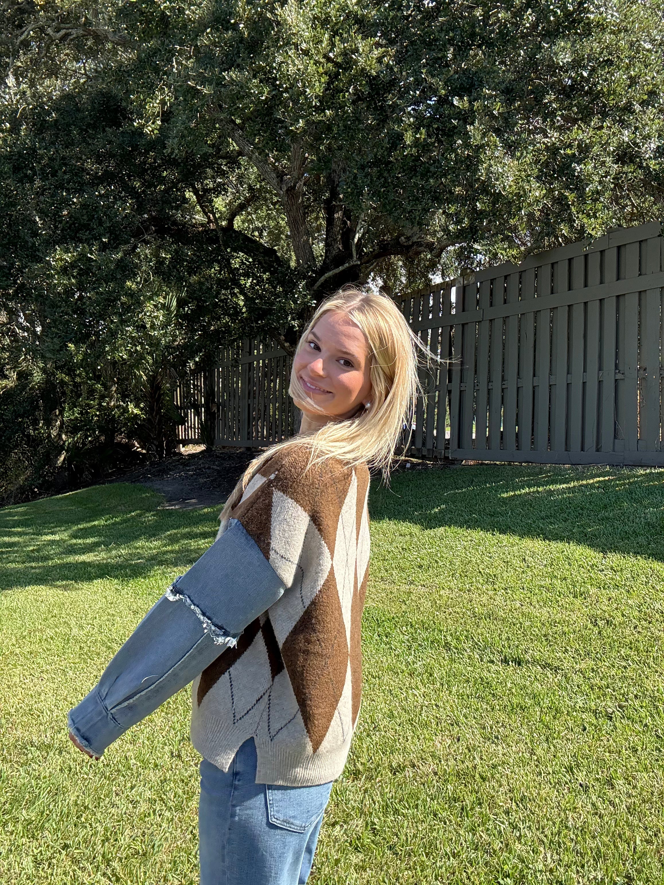 • Cozy argyle knit sweater in neutral tones of brown, beige, and gray