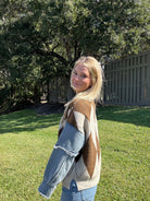 • Features contrasting denim-style sleeves for a unique, modern twist