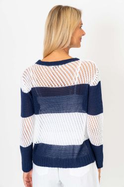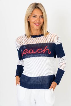 Bring seaside vibes to your wardrobe with this boho-inspired beach sweater. Featuring bold navy and white stripes with playful open-knit detailing and “Beach” embroidered across the front, this lightweight sweater is perfect for breezy days by the water or casual weekend wear. Pair it with denim shorts, linen pants, or layered over swimwear for the ultimate coastal look.