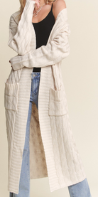 Front: Open-front with wide ribbed shawl collar (no closure)