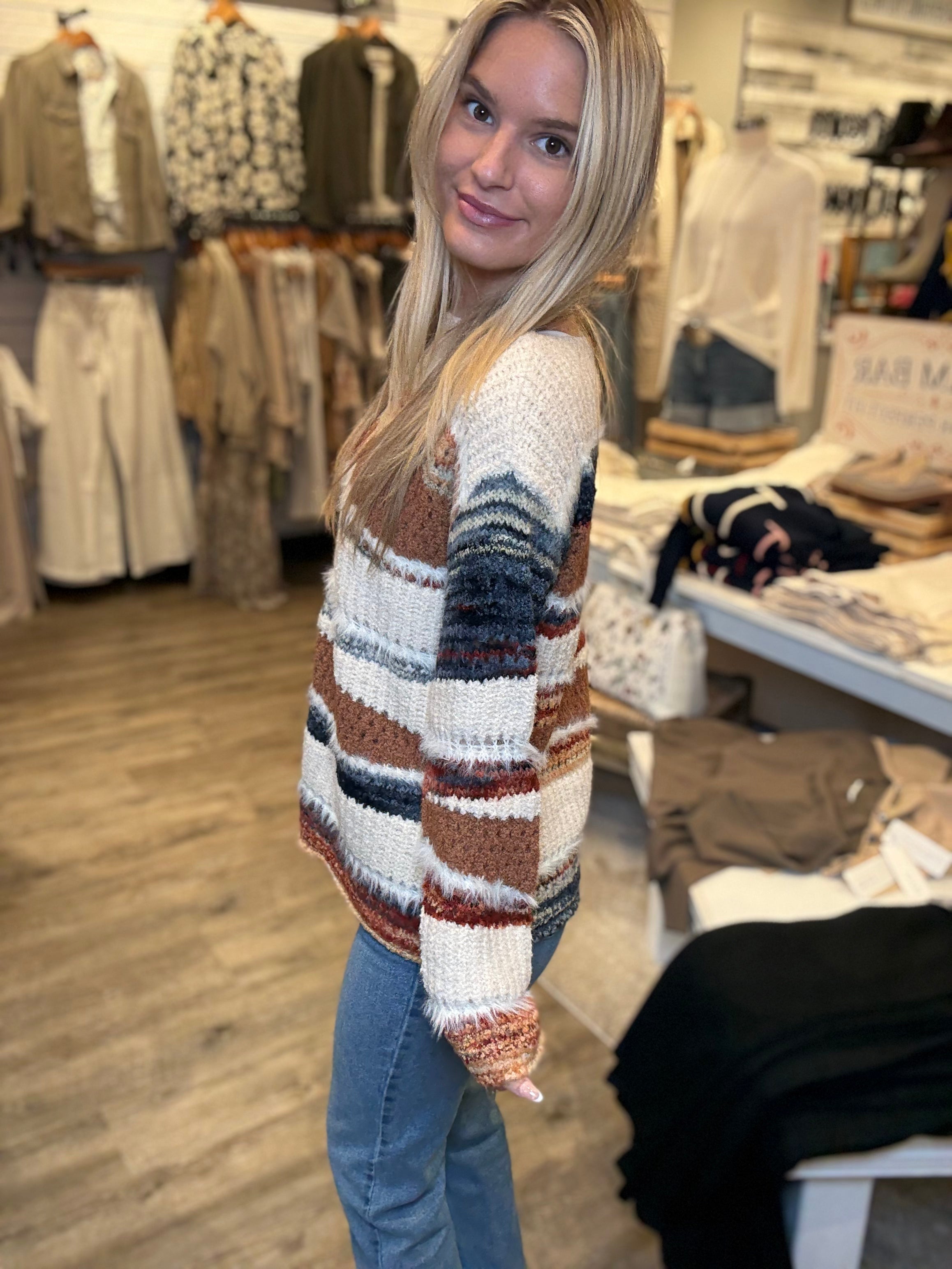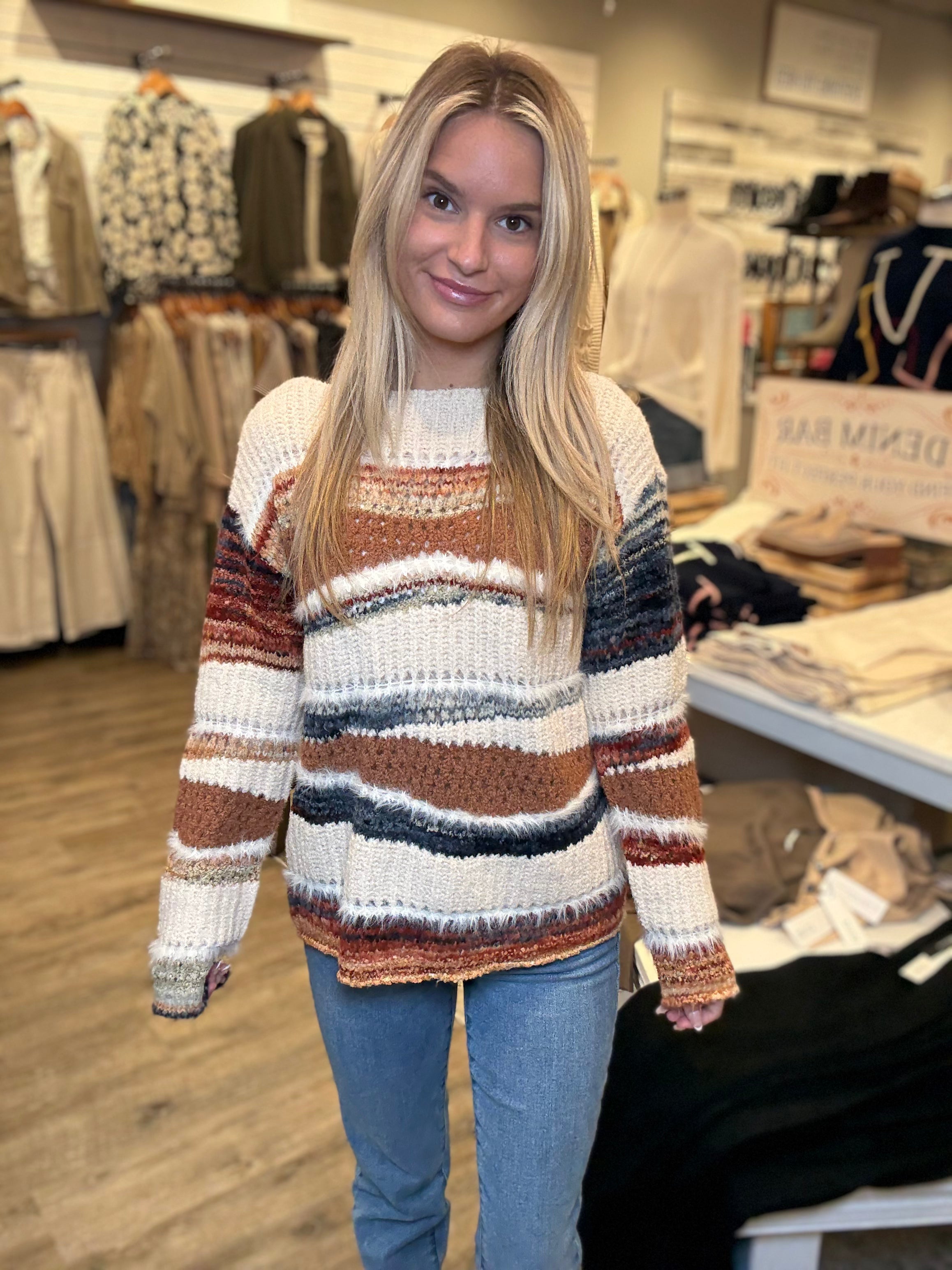 Charlie B’s Mixed Knit Striped Sweater blends cozy comfort with artful design. Each stripe is a unique mix of color and texture—soft, organic, and a little bit playful—woven together in warm neutrals with a subtle pop of mauve. The result is a sweater that feels both timeless and refreshingly modern, perfect for slow mornings, crisp walks, or casual evenings out.