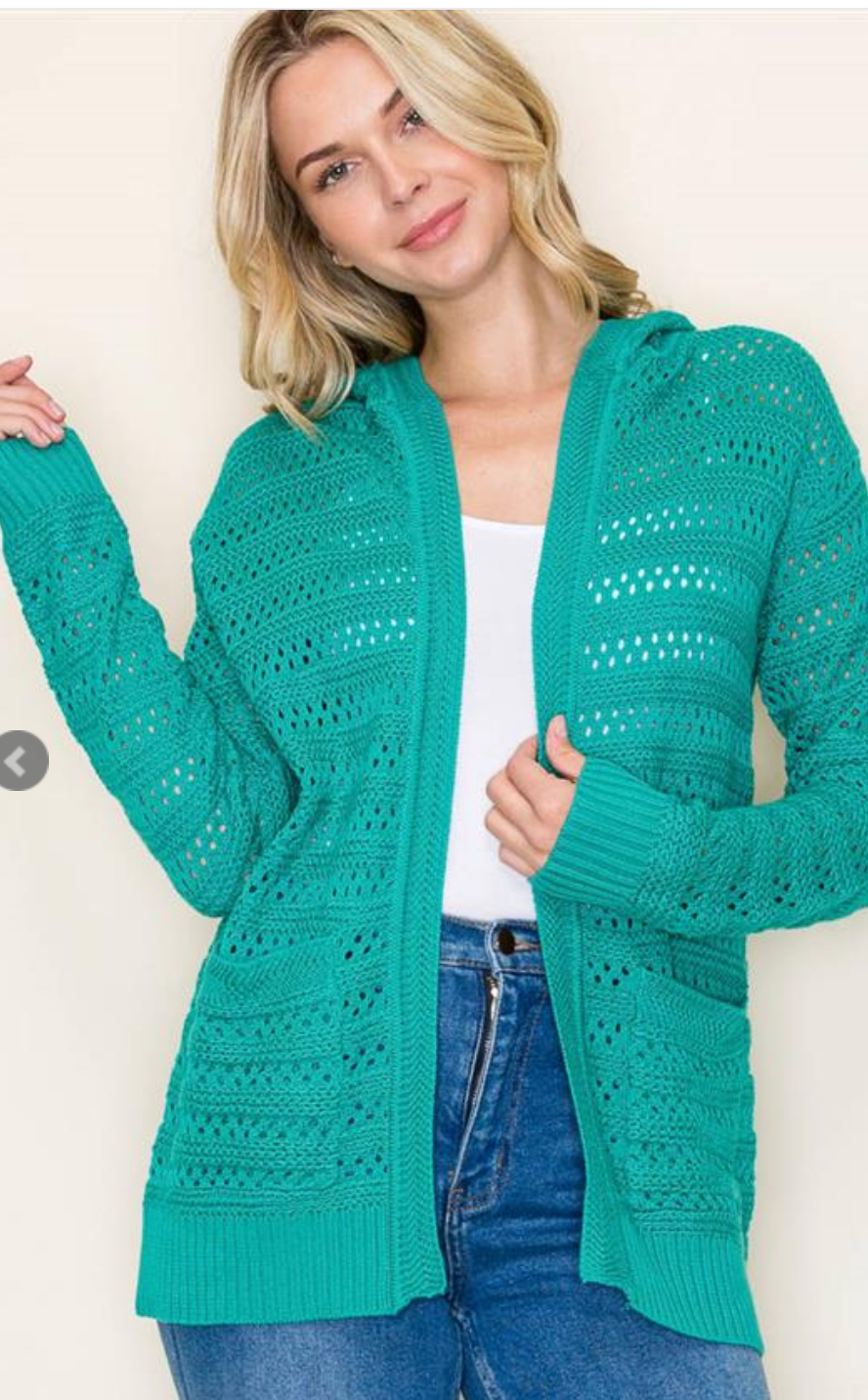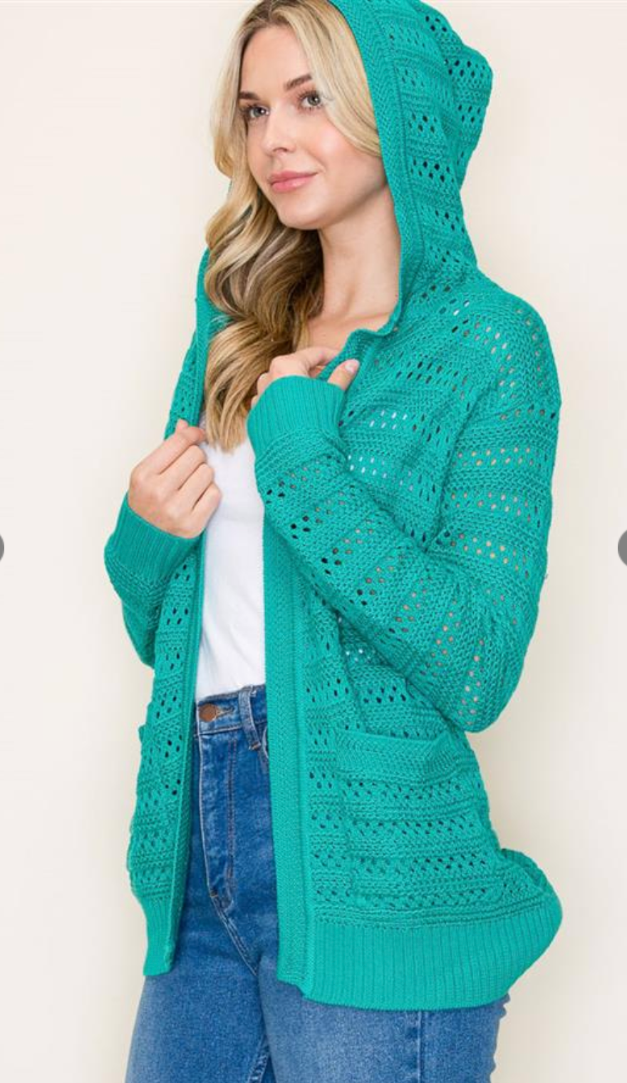 CROCHET LIKE, LONG SLEEVE, PATCH POCKETS, OPEN FRONT, HOODIE SWEATER CARDIGAN