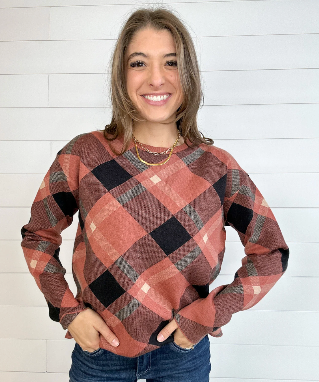Add a pop of fall charm to your everyday style with this cozy plaid sweater. Featuring a bold rust and black check pattern, this pullover combines warmth with a touch of timeless design. The relaxed fit makes it perfect for layering over jeans or leggings, giving you a casual yet put-together look for any occasion.
